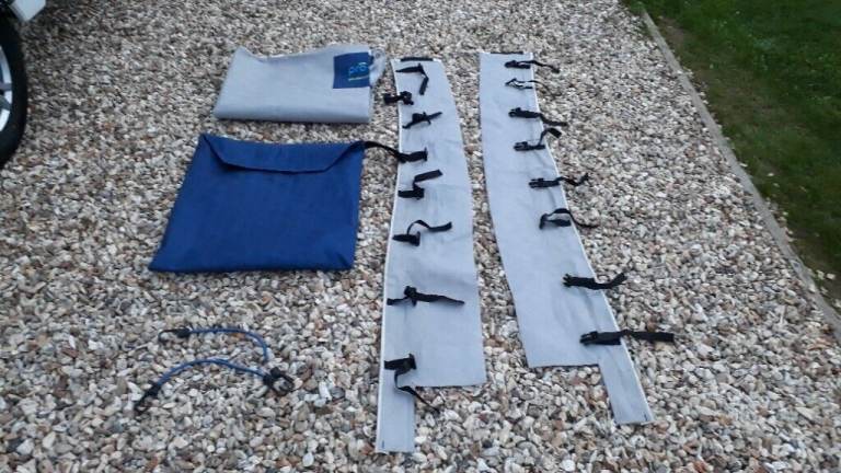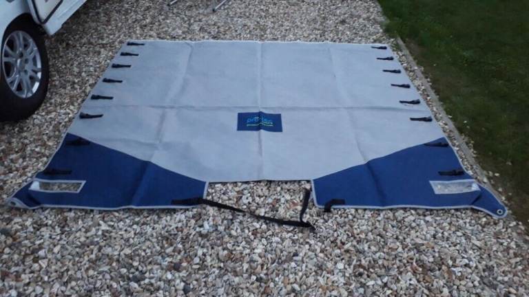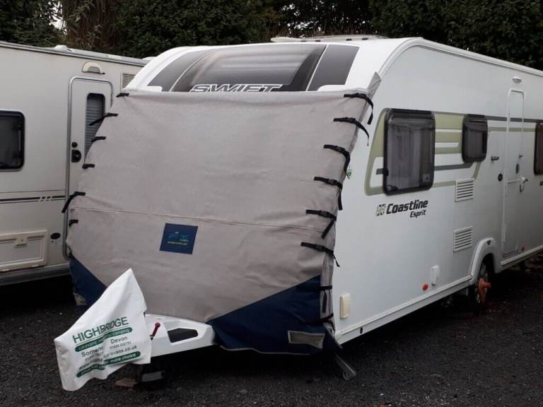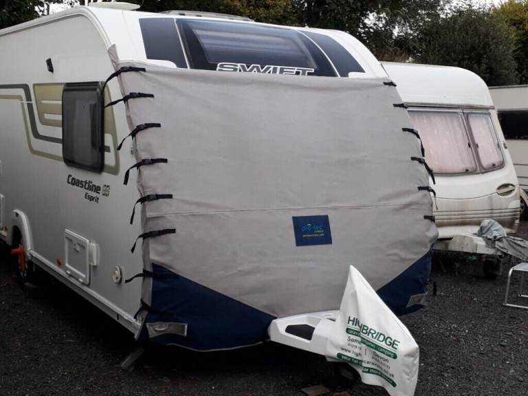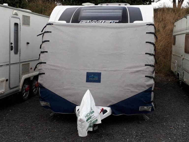Pro Tec caravan towing cover. Cover originally made for a Lunar Delta RI. I've been using it on my 2014 Swift which when used with the side sections the opposite way around fits really well with the lights also in the correct position as seen in the pictures. The stitching has pulled away slightly to two of the buckles on the side sections seen in pictures and a small patch has been used on the rear side to prevent a very small hole from becoming bigger seen in the second to last picture (in relation to position on cover, it is just above half way towards the left) last photo shows the cover on the Lunar Delta RI. Can post at additional cost.
