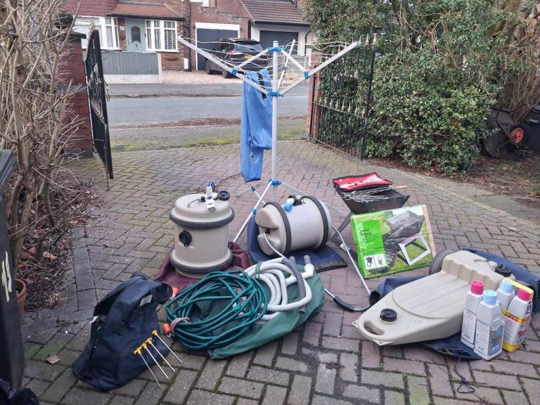 Every thing from holding down pegs all in good working condition :- 2 air beds with electric & foot pumps, 2 x 40Ltr Aqua rolls, hoses, pump, mains float, wastesmaster, washing drier, barbecue, + utensils, sanitary fluid, roll out Fiamma awning, all these items have storeage bags, television. Mattress toppers, bedding - towels ( all washed), 240v hoover, crockery- culinary- cooking items. (All cleaned), collapsible cupboard. Caravan cover 6.4 long x 2.26 wide, breathable.