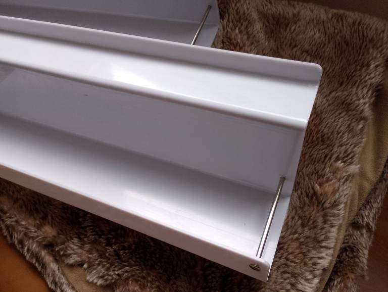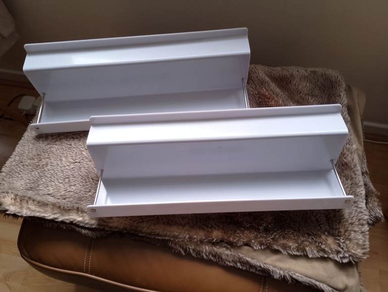 Two roof level storage shelves that hook on by the roof struts to provide eye level storage for tea coffee sugar cups phone's tablets etc for VW T4,5,6,6.1 but not T7, they slide in the groove just beneath the bed platform, cost £90 new selling as a pair, very useful for keeping the van clutter free and well priced, our van now sold, other items also for sale call for info