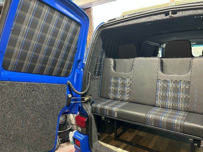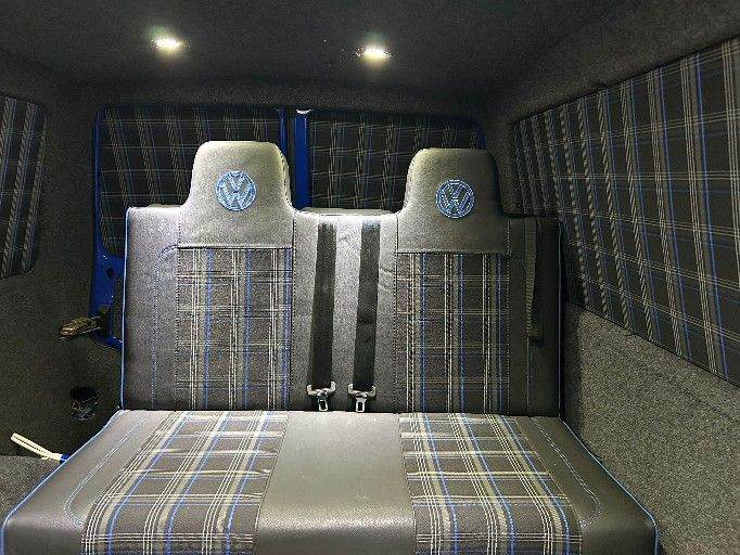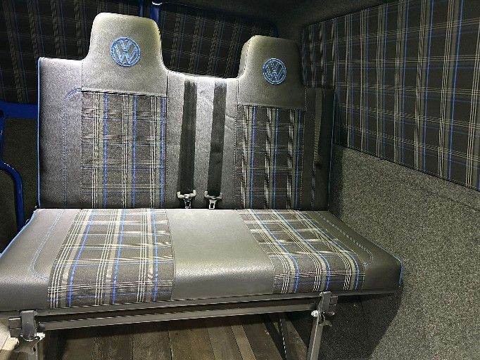One pictured is a Blue GTI Tartan RNR bed/seat upholstered cushions, attached to our Strong and very well made, M.O.T Compliant, 3/4 size Rock And Roll bed frame.