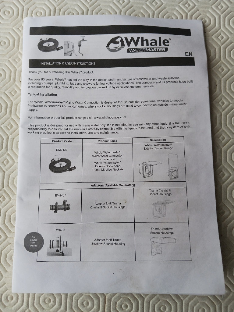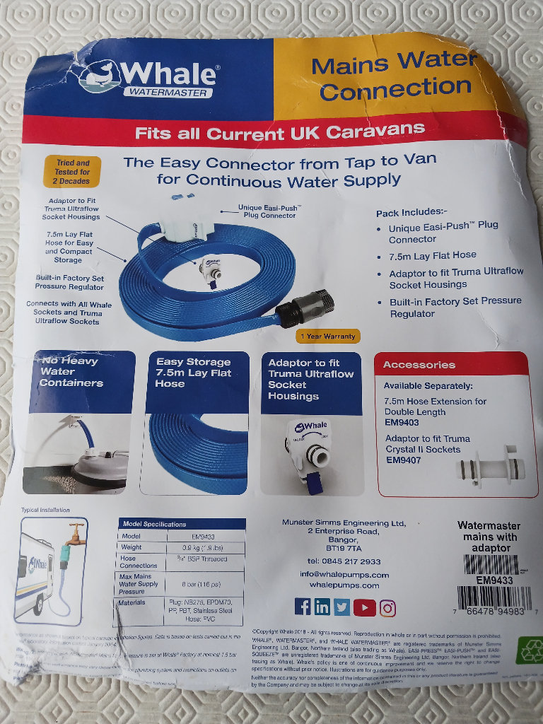 Whalemaster mains water connection for all current UK caravans for a continuous water supply without the need for an Aquaroll or water container.
