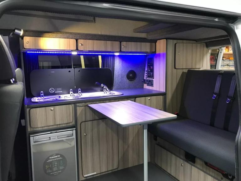 · FULL SIDE CONVERSION- It will include kitchen unit with 2 cutlery compartments and a large storage area, a smev combination sink and 2 burner hob unit, with over kitchen storage unit. Wardrobe/ Cupboard unit with front door and 2 x rear doors. All the furniture in this conversion will be made from caravan/motorhome lightweight grade ply. We never use heavy, easy to damage chip wood, in our conversions. Full choice of furniture colours are available.