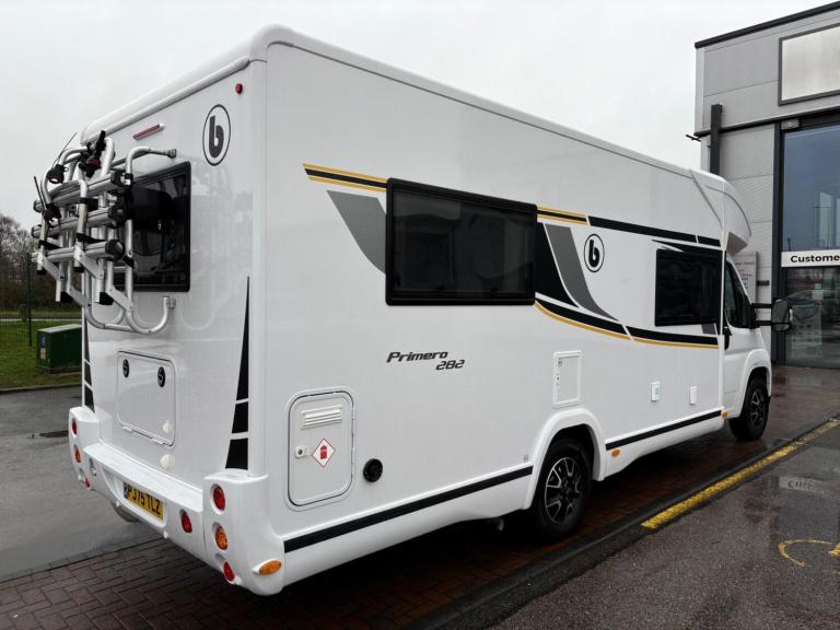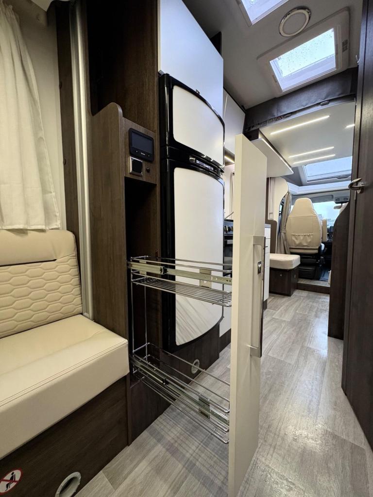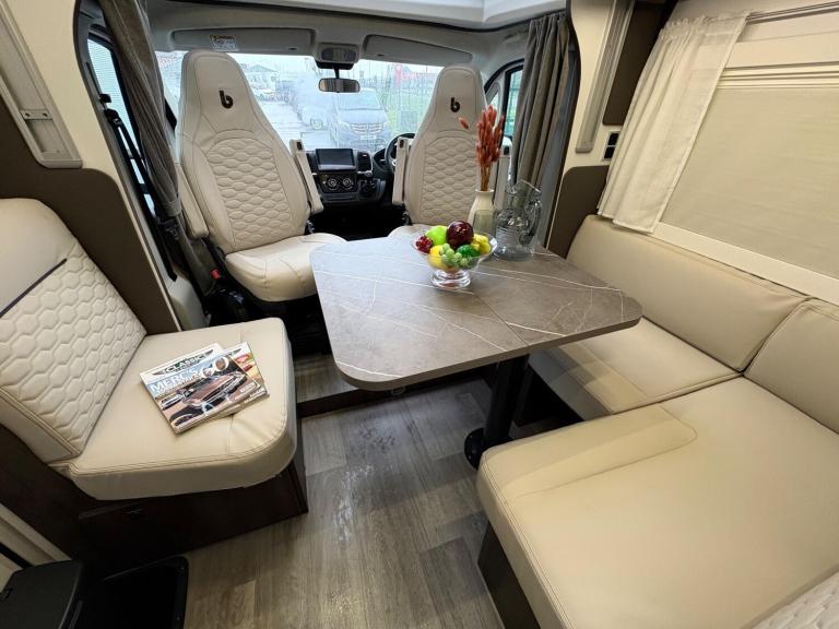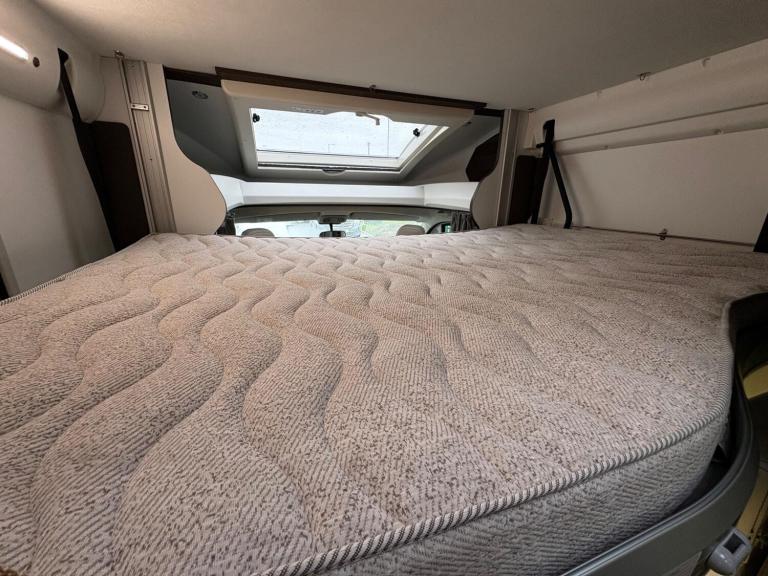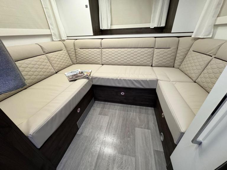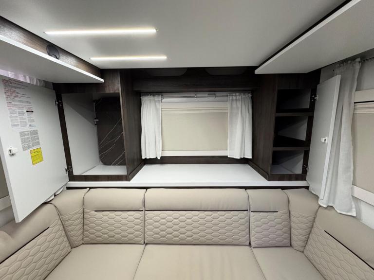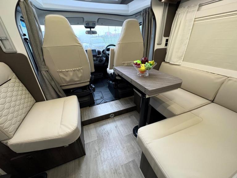 A rare 6 berth and 4 belt model with 2 electric drop down beds, one at the front and one at the back and a lounge conversion to comfortably fit 6. An end U shaped lounge and a large dining area. Practically brand new in condition and has hardly been used. Lots of living space and a large bathroom with a toilet and a shower. A large fridge with a separate freezer, Truma heating, an external awning and bike rack, fitted blinds and front cab curtains.For more information call 01522 246777.