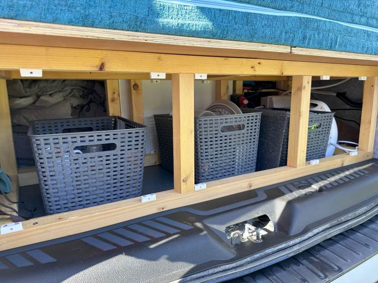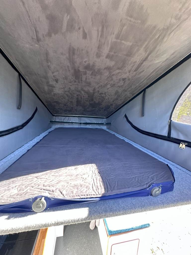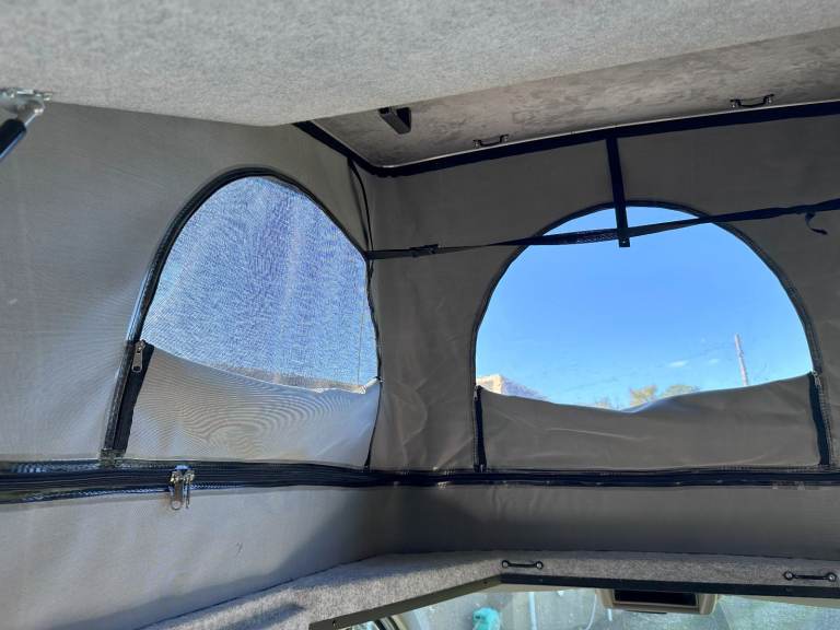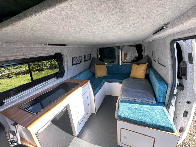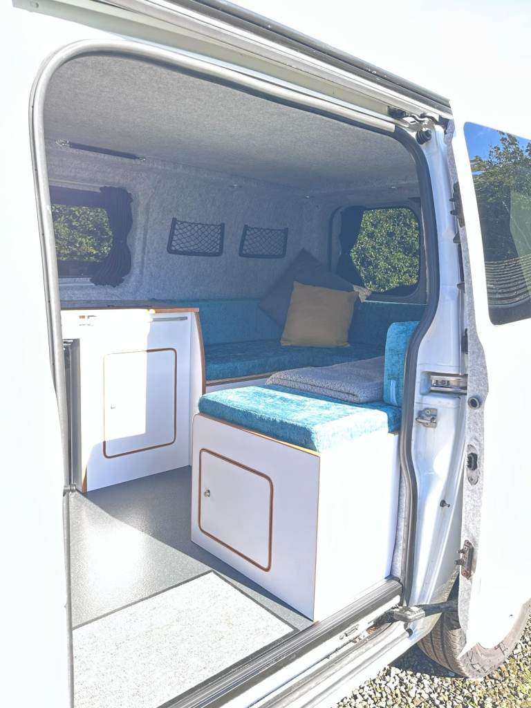 The Van layout is in a U-Shape set up meaning you have alot space when sitting inside to put your feet up or have more than 2 people (unlike the common rock and roll bed set up) inside at one time. The seats have been designed to unfold into a double bed as seen in the photos with an easy folded bed board design. This also give ALOT of storage space for bedding, utensils and luggage.