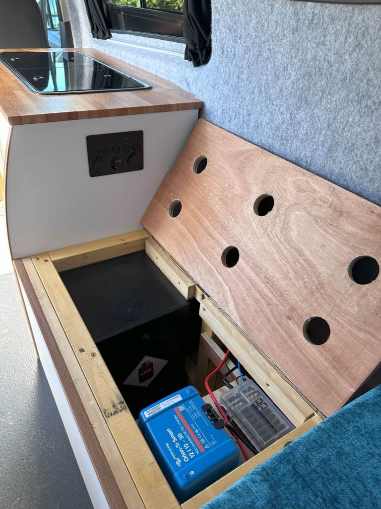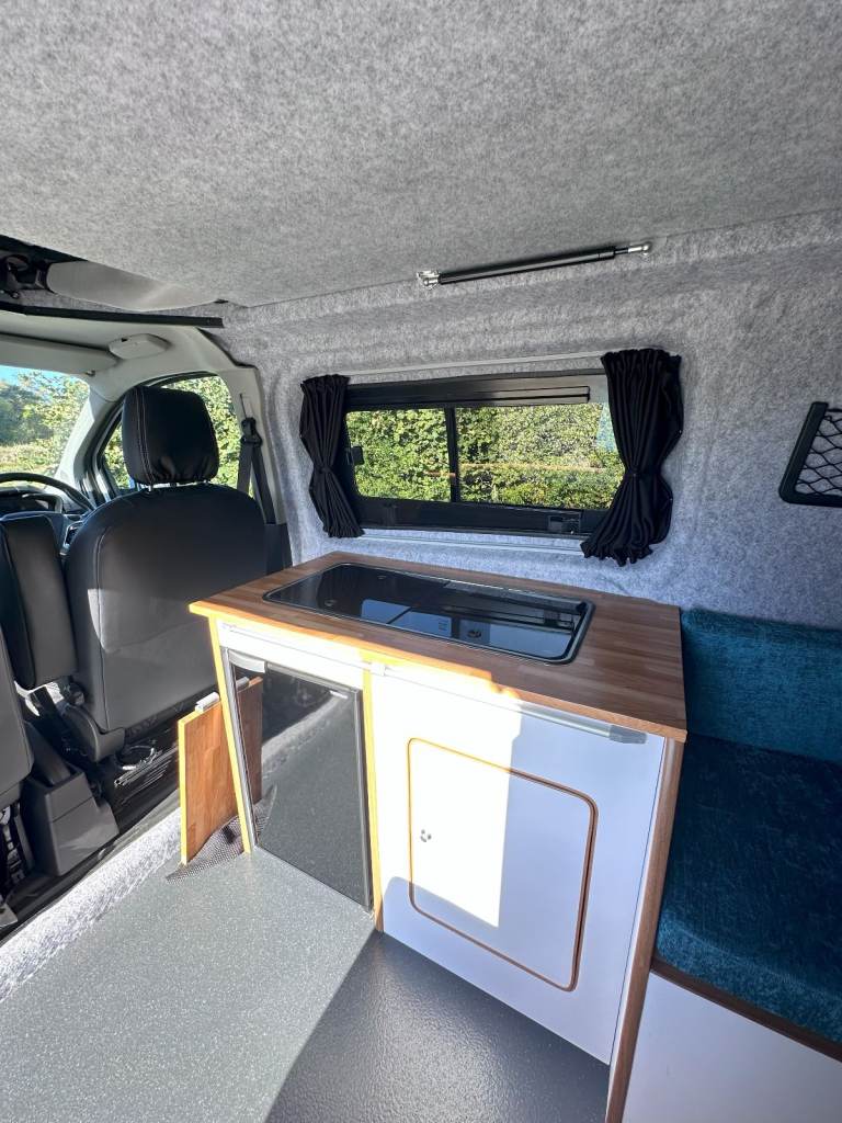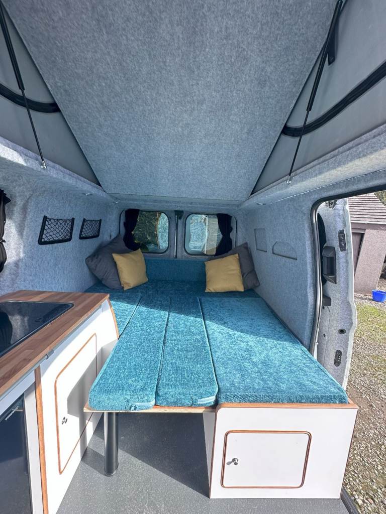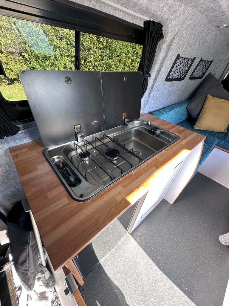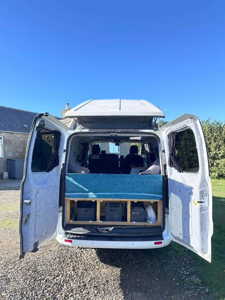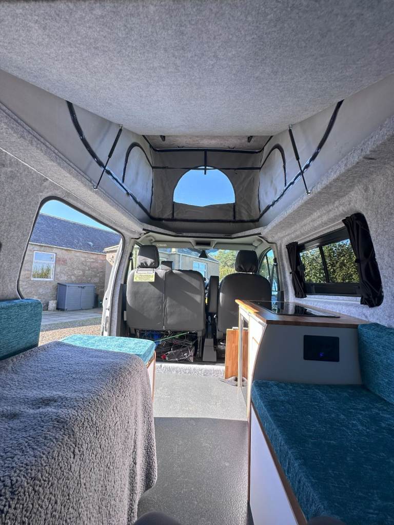 Located in Stonehaven area, our Transit custom campervan is for sale. This campervan has had the pop top conversion with the double skin thick leather material. It also contains inside, a fridge, two Gas hobs, sink with taps and water pump for running water and interior lights with all run off the 100amp/hour Lithium leisure battery. The van is also equipped with electric hook up point and two 13amp plug sockets. The leisure battery is connected through an Orion-Tr Smart DC charger which means while the engine is running the leisure battery is being charged automatically. The Volt meter inside the van gives you a clear reading of the current battery life.