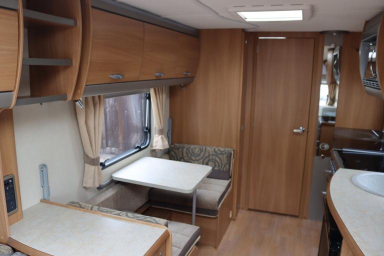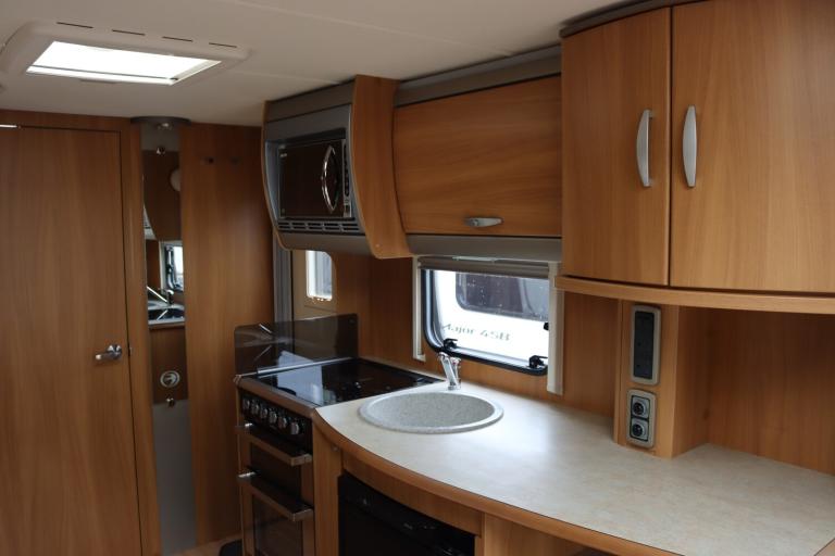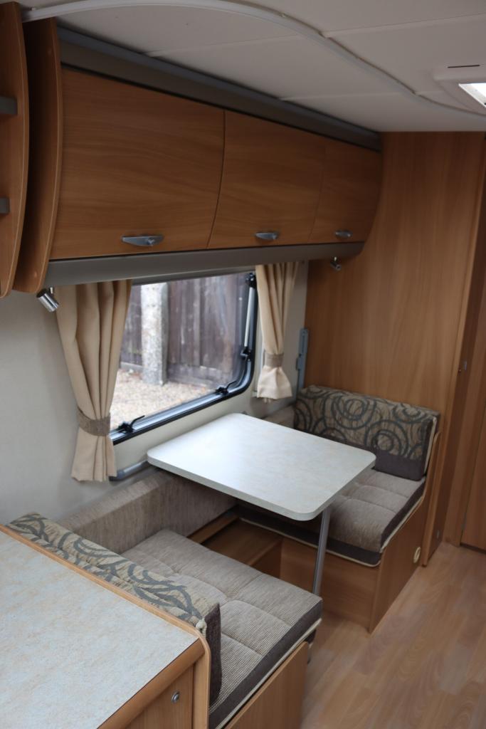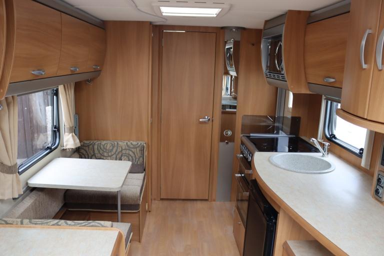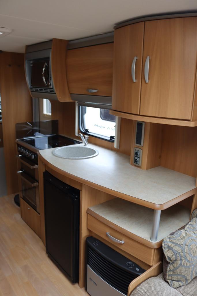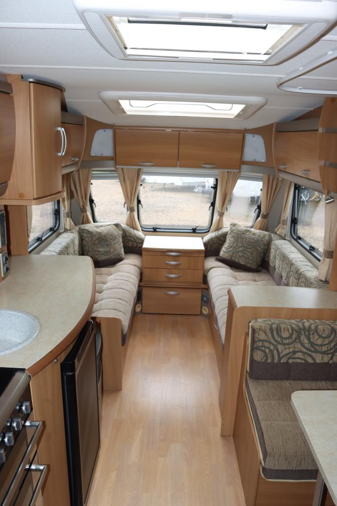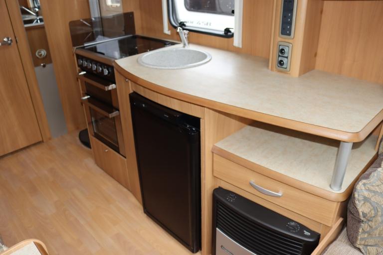 In the kitchen area there is a oven, grill, 3 gas hobs and one electric hob, microwave and a large 3 way fridge with freezer compartment. Plenty of work top space. Seating area at the front of the caravan makes into a double bed. There is a seating area in the middle of the caravan that can convert into a single bed or bunk beds (optional). There is convenient storage underneath seating area at the front of the van and in the middle of the van, with storage in the overhead lockers (aircraft style overhead locker system with split level storage). At the rear end of the van there is an end washroom with a toilet and a separate shower. The caravan provides blow air heating and water heating (operates on either gas or electric), blinds and screens to windows and rooflights, TV Aerial, two part exterior door with door flyscreen. Has AL-KO Stabiliser, alloy wheels, external storage locker, external/awning light and spare wheel.