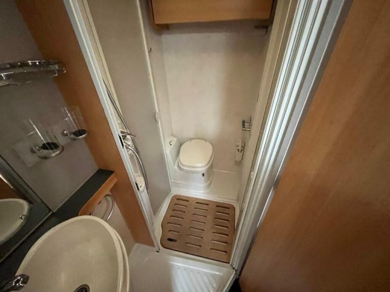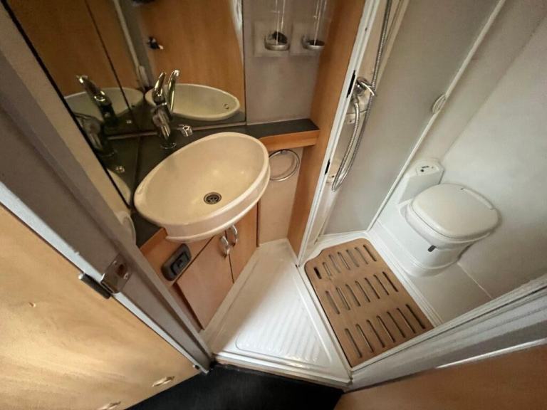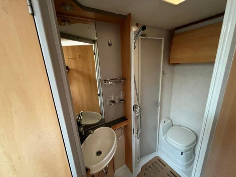 At the rear there is an extremely comfortable fixed French bed, which means that you don't have to keep making it up each day and sacrificing the living space. It is on gas struts and lifts easily to reveal additional storage which can also be accessed by an external locker door. Next to this is a good sized washroom with washbasin, Thetford cassette swiveling toilet with electric flush and shower unit.
