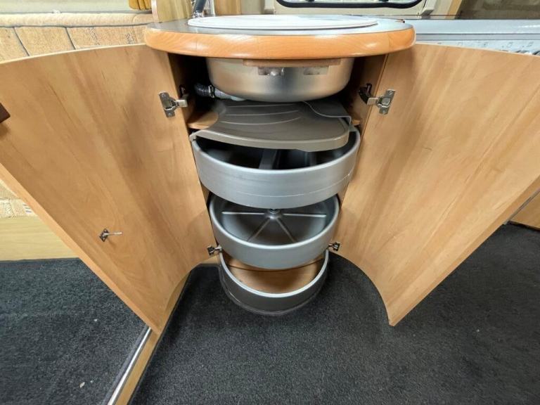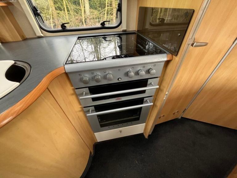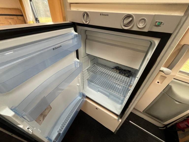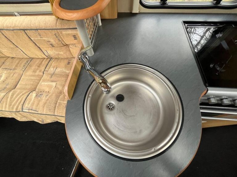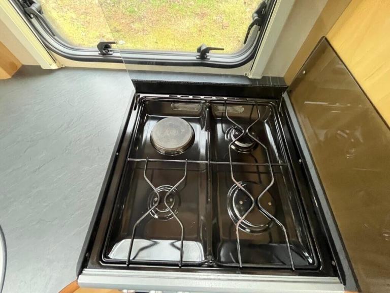 The motorhome comes with a well equipped kitchen which includes an oven, grill, microwave and dual fuel hob with 3 gas burners and electric hotplate.