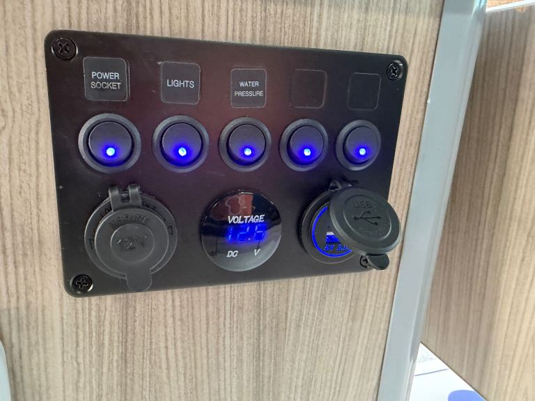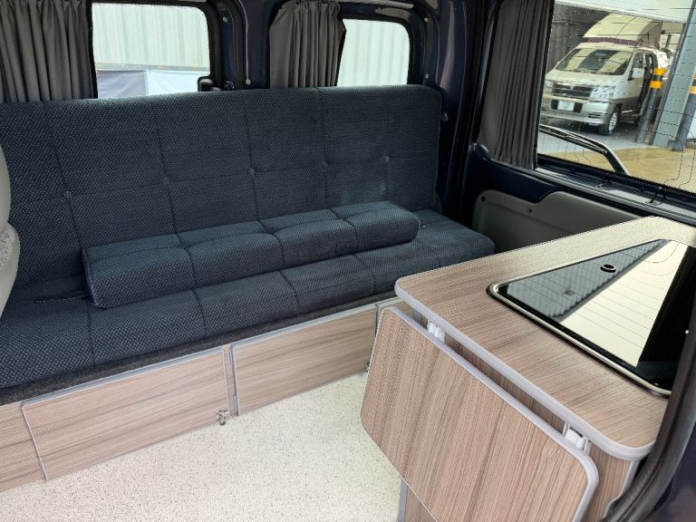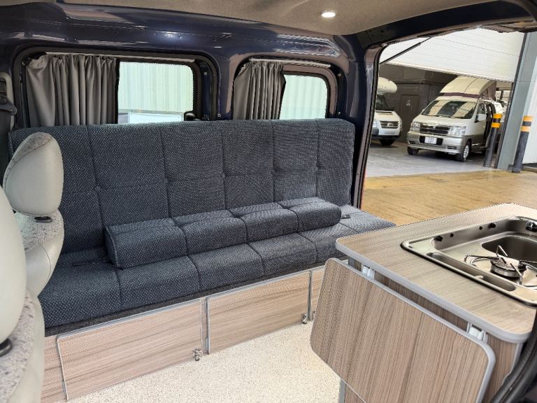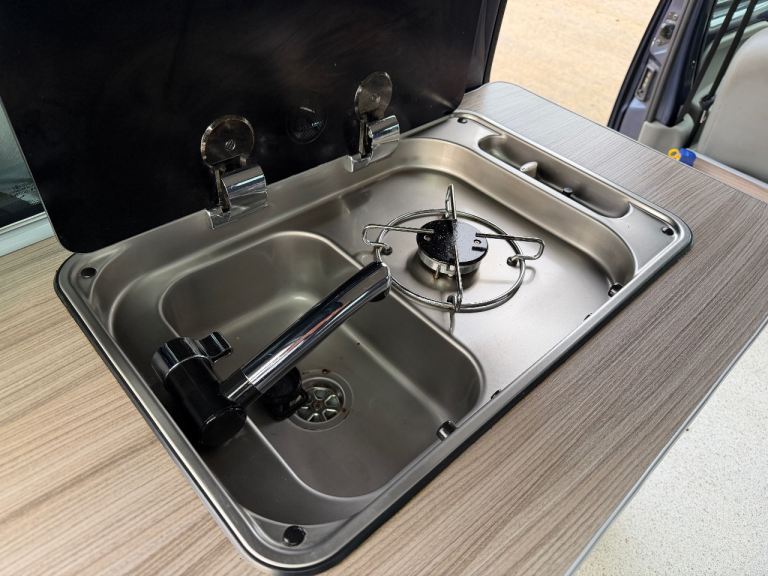 Specification includes: Side sofa turns into compact double bed, gas hob, sing with cold water tap, 12v leisure battery system, 12v control panel, 12v sockets, 240v hook up, 240v socket, pop up table, 12v lighting, Air con (front cab).