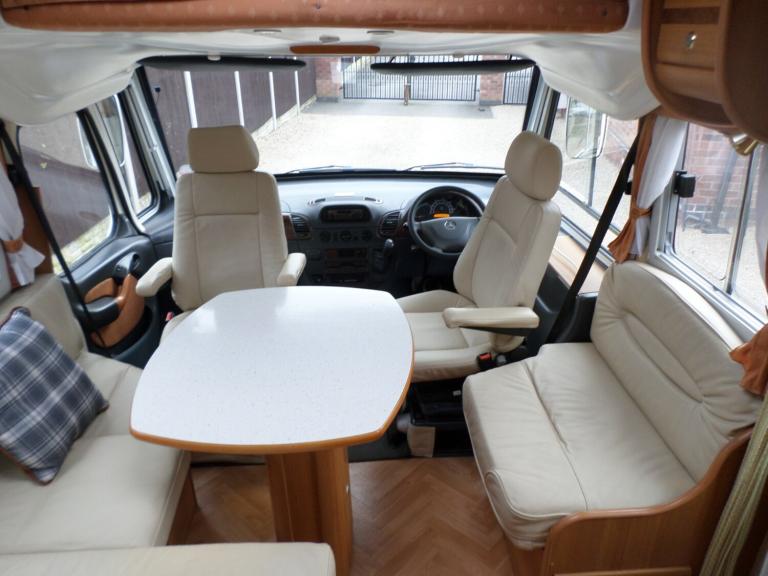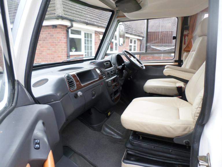 SPRINTER PILOTE LE VOYAGER 2.7 DIESEL, 3500 kg, ALARM, CENTRAL LOCKING, RADIO MULTI CD STEREO, REVERSING CAMERA, CAB AIR CONDITIONING, DIESEL ENGINE PRE-HEATER. CRUISE CONTROL, UNMARKED EMBOSSED CREAM LEATHER SWIVEL CAPTAINS CHAIRS, CREAM LEATHER DINING AREA WITH SWIVEL TABLE, DRINKS CABINET, GAS DOUBLE HOB, EXTRACTOR FAN, MICROWAVE, FRIDGE FANS, GRILLE / OVEN, STAINLESS STEEL SINK WITH SINGLE DRAINER AND MIXER TAP. REAR FIXED DOUBLE BED, FRONT ELECTRIC DROP DOWN DOUBLE BED, GENEROUS WARDROBE AND STORAGE, SEPARATE SHOWER, FLUSH TOILET, LPG ON BOARD GAS TANK, LPG 12V GAS GENERATOR, SOLAR PANEL, LEISURE BATTERY, 240V INVERTER, OYSTER SATELLITE DISH, TELEVISION, AMPLE STORAGE, NEW TRUMA COMBI BOILER, DEPLOYABLE SIDE STEP, ON BOARD WATER TANK, FULL UNUSED AWNING, FULL TOW PACK, OUTSIDE SHOWER, FULL FITTED CARPET THROUGHOUT, REAR DETACHABLE STORAGE BOX, VEHICLE HAS BEEN STORED INSIDE, LOOKS AND DRIVES SUPERB, FULL SERVICE HISTORY, FEBRUARY 2027 MOT