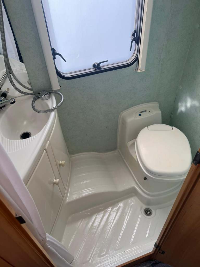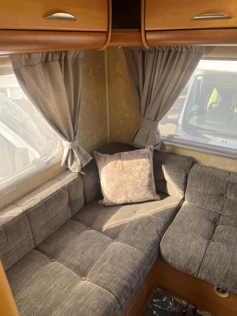 Starting in the the living area of this motorhome you have a lovely spacious U shaped lounge with windows that give fantastic panoramic views. At night time the sofas come together to create a king-size bed or alternatively the 2 sofas can be used as single beds. The kitchen is well equipped, complete with oven and grill and 3 gas burners. There are numerous lockers, cupboards and drawers to store all of your kitchen essentials. Opposite the kitchen is the second lounge/dinette and here you have forward and rear facing 2 seater sofas both of which have two seat belts giving six seat belts in total for the motorhome. The dining table fixes onto a side rail and this can be removed when you are travelling if you require more space. At bedtime the sofas convert into a double bed. The remaining 2 sleeping berths are in the huge over-cab bed and this has loads of headroom so two adults can comfortably sleep here. Finally the washroom, with shower, toilet, a wash basin with mixer tap and a mirror. Other features include - Awning, bike rack, solar, TV, central heating and much more!