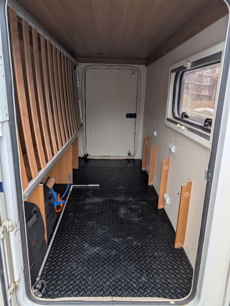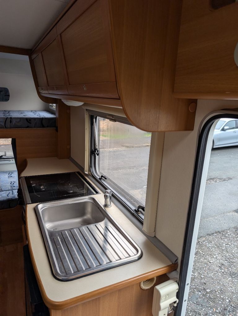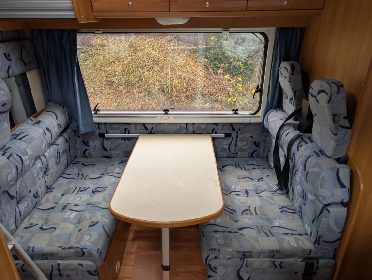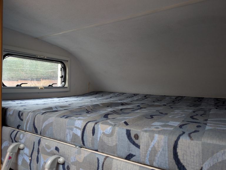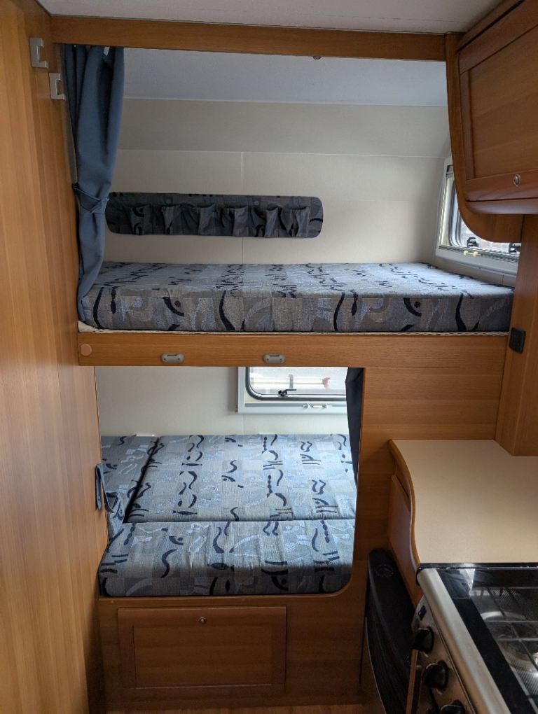 - Layout: 6-berth with the classic rear bunk configuration. The bottom bunk folds to create a large garage space.