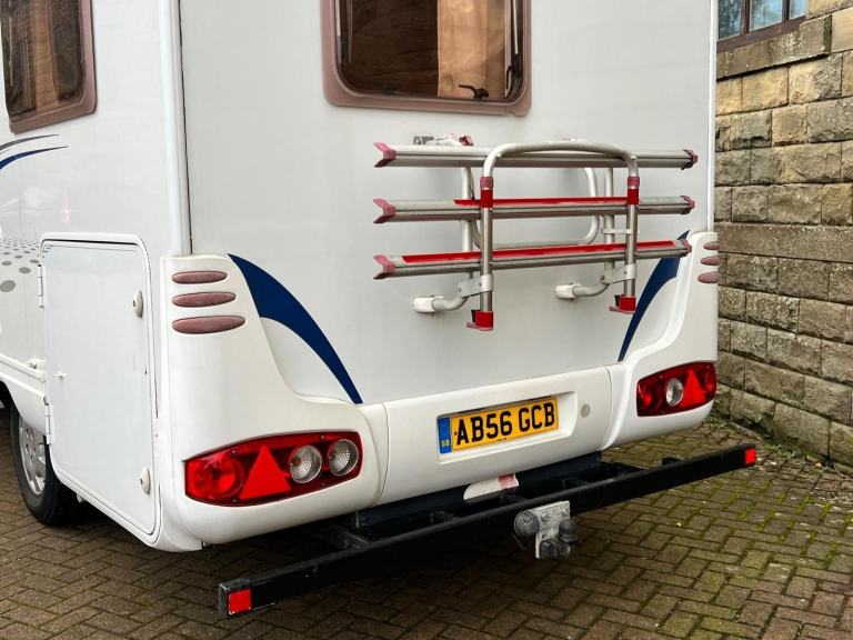12v Power, ABS, Alloy Wheels, Awning, Cycle Rack, External Storage Locker, Fixed Bed, Fresh Water Tank, Fresh/Waste Water Tank, Fridge, Gas Heater, Gas Hob, Gas Water Heater, Heki rooflight, Hob, Large rooflight, Leisure Battery, Lined Curtains, Mains electric, Multi-Directional TV Aerial, Pull Out Bed, Rear Seat belts, Shower, Swivel Chairs, Swivel Drivers Seat, Swivel Passenger Seat, Toilet, Tow bar and electrics, Wind Out Awning