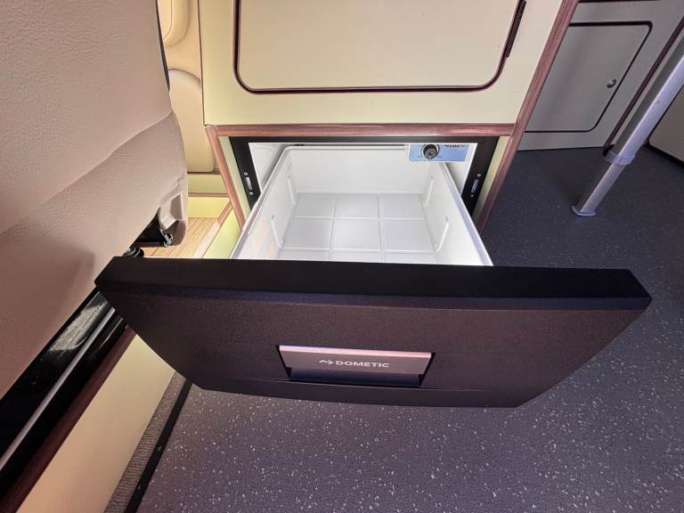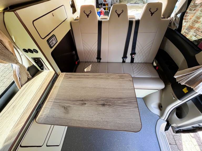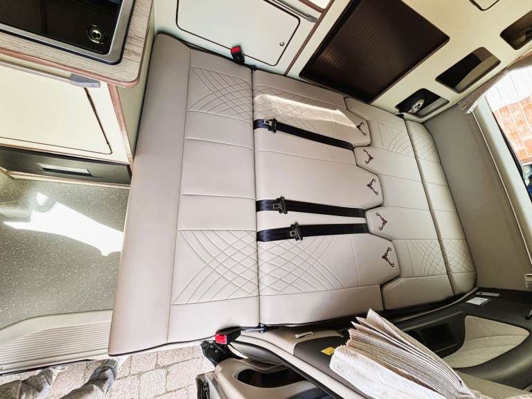 Stepping into the living space through the electric sliding door you have a sofa style seat in matching Cashmere leather fitted with 3 travel seatbelts.The sofa is a Fabworx 125cm wide rock”n” roll bed. To add to the rear seating the front passenger seat swivels creating a very sociable space. There are two tables neatly stored under the sofa for dining or drinks.