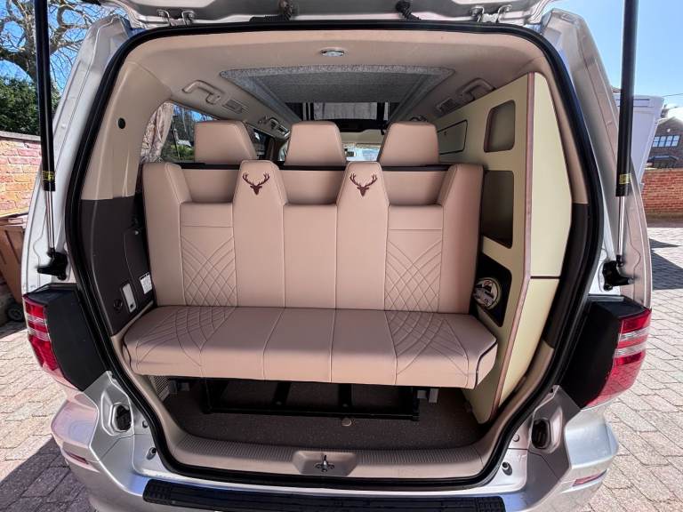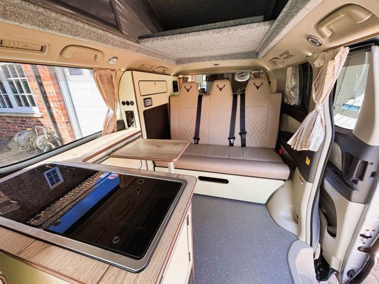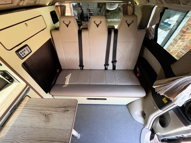 The cab is a very comfortable place to be with full Cashmere leather seats with Mocha piping, Milldown campers Stags head logo embroidered and fully carpeted with over rugs.
