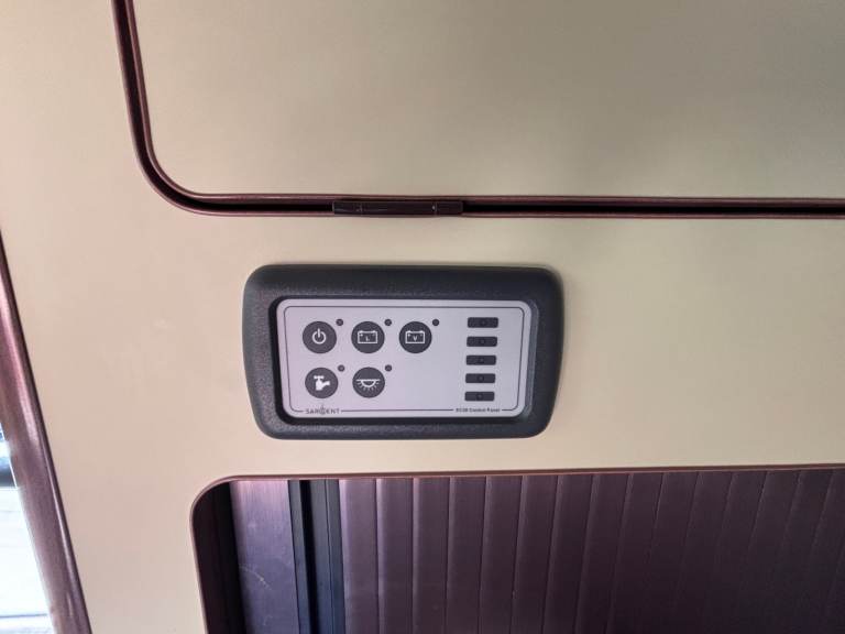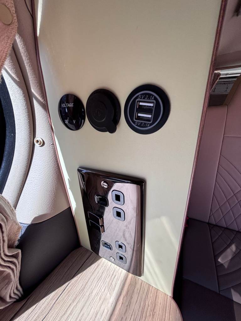 Leisure battery with split charging system , mains hook up with 240v double socket, USB charging ports , voltmeter and LED dimmable lights.