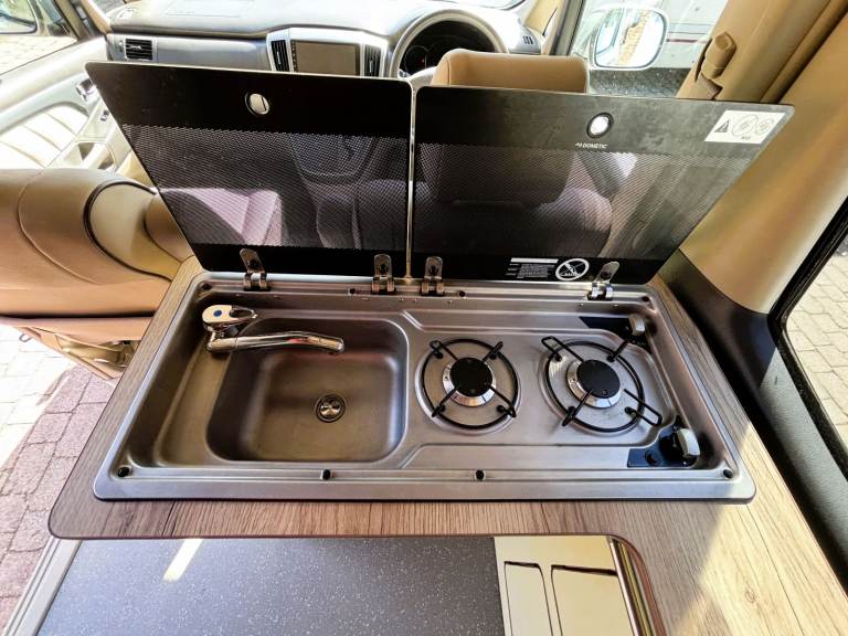 The neat Milldown L shaped kitchen is very practical with plenty of storage cupboards, a Dometic, slide out, 12v fridge and a Dometic sink/ hob combo with two gas burners running off a camping gas canister and a tap in the sink with running water from the onboard fresh water container.