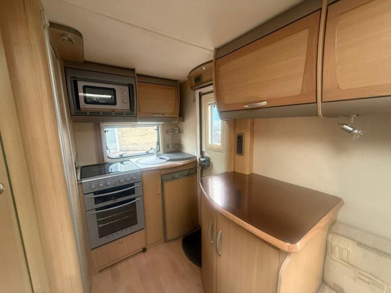 The interior layout of this Bessacarr E435 consists of an end washroom & kitchen. The spacious wash room has a WC, shower, wash basin & vanity unit.
