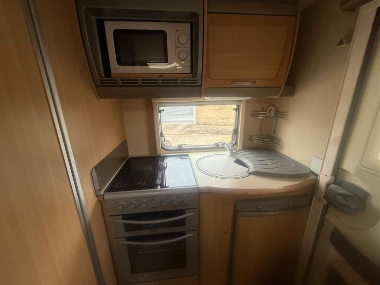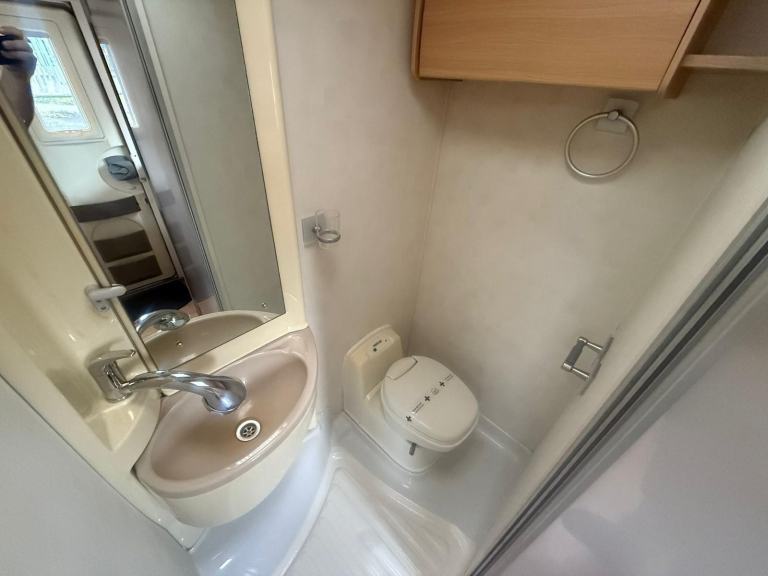 The interior layout of this Bessacarr E435 consists of an end washroom & kitchen. The spacious wash room has a WC, shower, wash basin & vanity unit.