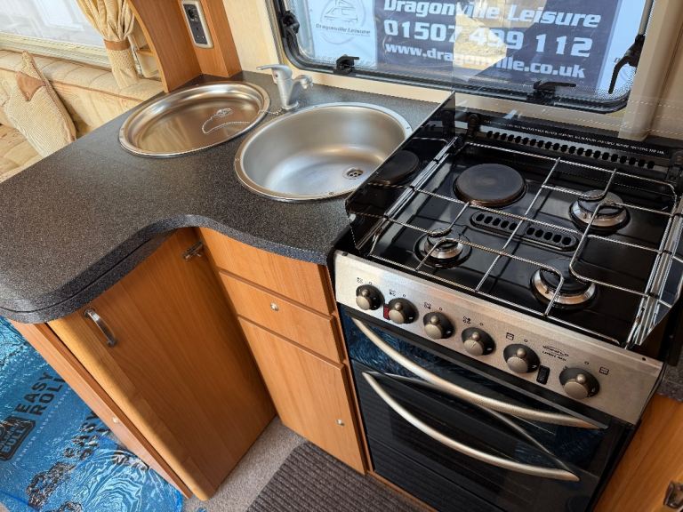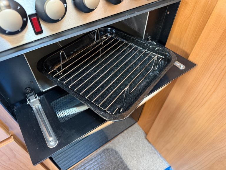 The well-equipped L shaped Kitchen provides an oven, Grill, 3-Burner Hob, Electric hot plate, 3-Way Fridge & Freezer, Sink with separate Drainer. For more workspace the kitchen unit swings into the middle of the van and there is also fold down worktop.
