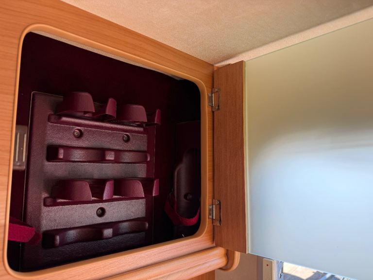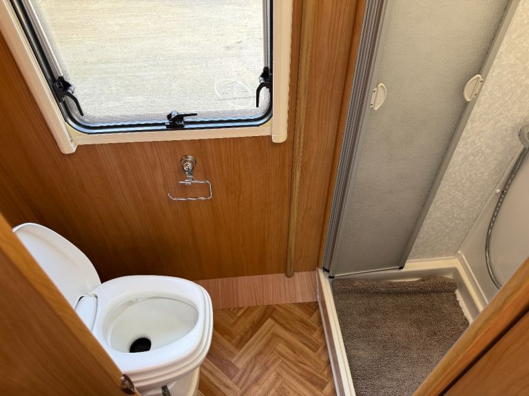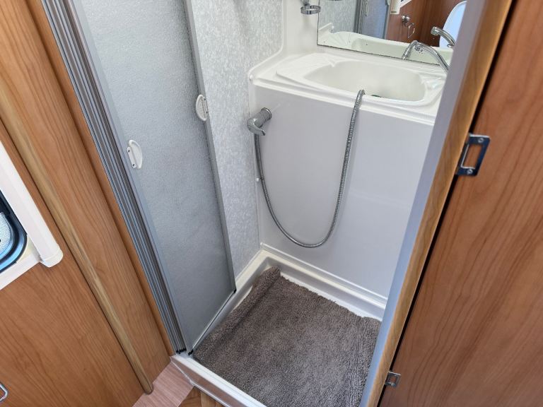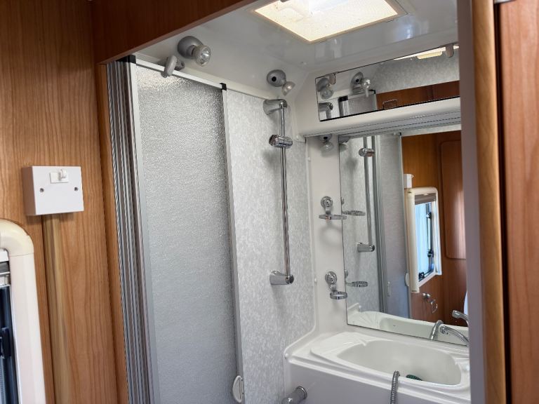 Gas & Electric blown air heating and De-Luxe digital control panel with Frost protection. This sought after layout features a spacious end bathroom with separate shower positioned at the rear of the motorhome with cassette toilet and washbasin. Makes a useful dressing room.