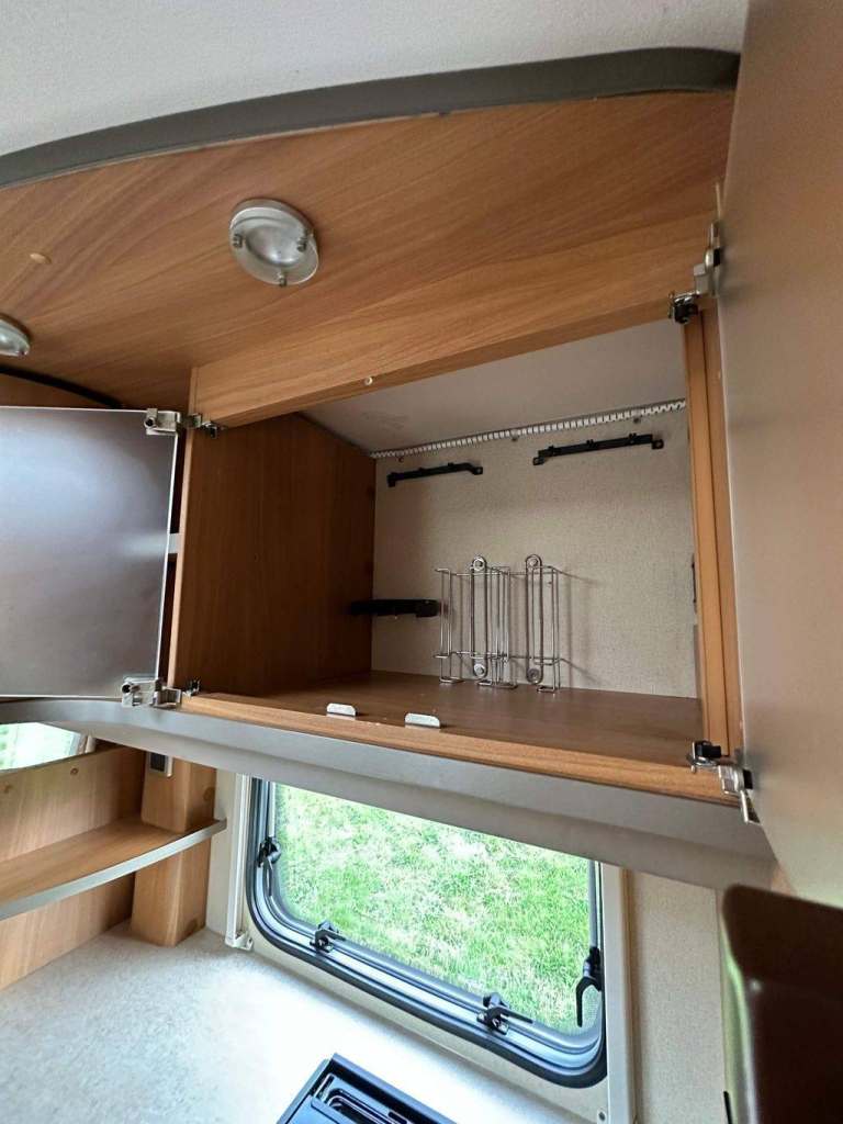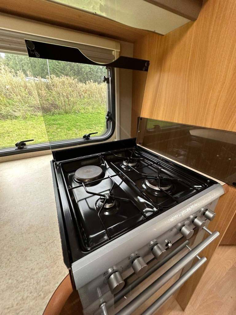 Starting from the front of the motorhome we have a very spacious bed over the cab which gives us the first of 2 berths, then down to a 2 seater dinette with a forward facing bench with 2 additional travel seat belts and a 2 seater side bench, and with 2 captain's chairs it makes a good and spacious dining area for dining or relaxing during the day. We then move on to the galley area which comes with a full size fridge freezer, a full size stove with oven, grill and a 3 gas and 1 electric ring hob. Then in the back we have the very comfortable fixed French bed that comes with a large amount of storage underneath. The toilet again comes fully equipped with a corner cassette toilet and a shower. Extras include; satellite dome, a bike rack with 2 bikes and a large amount of internal storage.
