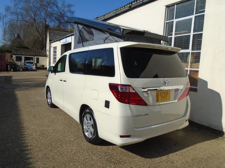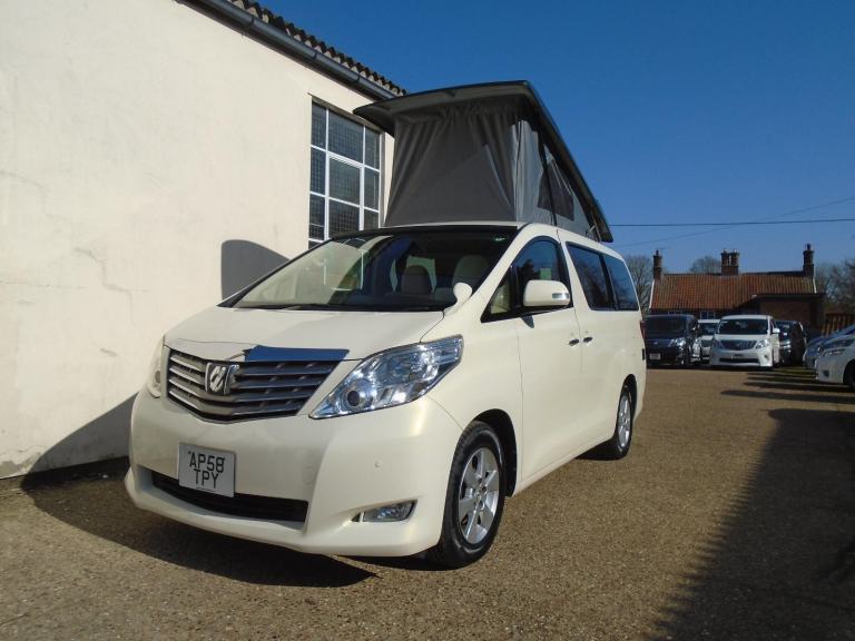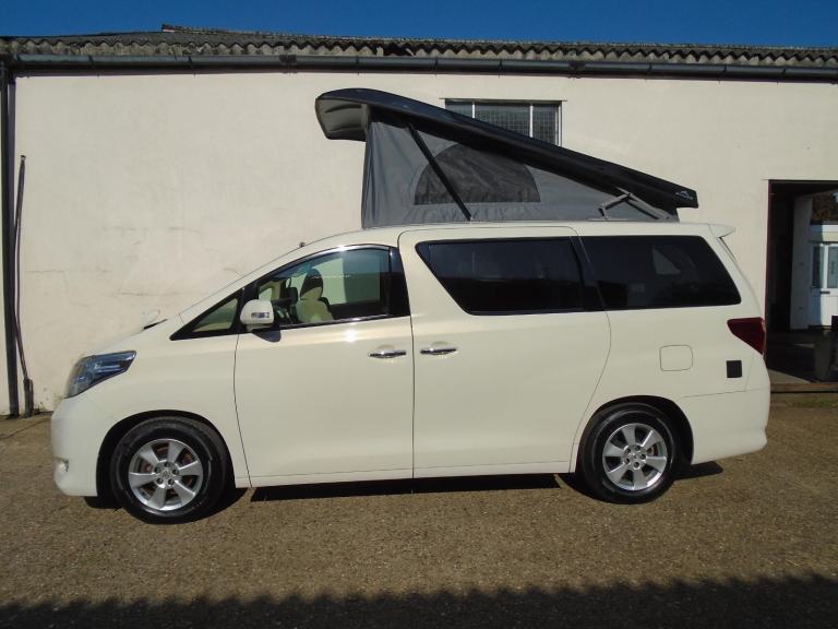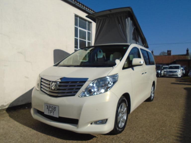 PRISTINE FRESH IMPORT NEW SHAPE TOYOTA ALPHARD 2.4 ECO 2009 YEAR FINISHED IN PEARL WHITE WITH CONTRASTING BLACK SLIM LINE ELEVATING ROOF~~~BIMTA WARRANTED MILES AND AUCTION GRADE ~~~ HAS OUR BRAND NEW OFF GRID CAMPER CONVERSION ~~~ 4 BERTH~~~SIDE KITCHEN~~FRIDGE/FREEZER~~~OFF GRID SOLAR PANEL~~~FULL CURTAIN SET~~~SWIVEL FRONT SEAT~~~UK ANDRIOD STEREO/GOOGLE MAPS/HANDS FREE/APPLE CAR PLAY~~~~FRONT AND REAR PARKING SENSORS+REVERSE CAMERA~~~~LEISURE BATTERY+MAINS~~~~SLIM LINE ELEVATING ROOF~~~FULL SERVICE~~MOT~~WARRANTY~~~THIS VAN IS IN PRISTINE CONDITION THROUGHOUT READY TO GO CAMPING DONT MISS >>>>> OVER 60 ALPHARD / VELLFIRE AVAILABLE. ANDYS IMPORTS EST 24YRS.