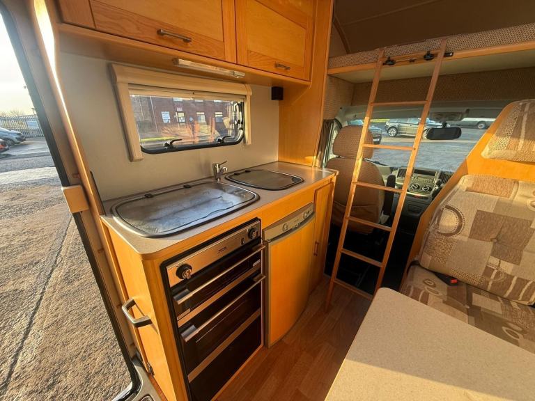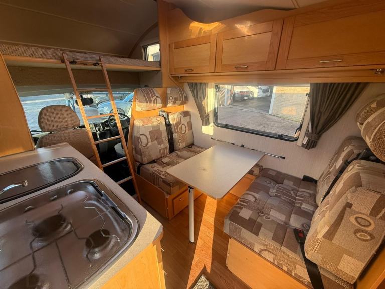 The sleeping arrangements consist of an overcab bed with the front and rear lounges converting into double beds. The sizeable rear lounge provides plenty of room for socialising and comes with a freestanding table. The spacious lounge area at the front comes with a double dinette. The central washroom comes equipped with a shower and curtain, toilet with cassette, washbasin, vanity unit and additional storage.The kitchen is equipped with a three ring gas hob, oven/grill, a Dometic fridge/freezer, a sink and plenty of storage room.Features of this motorhome includes, a bike rack, C02 alarm and a privacy curtain for the U shape lounge, Onboard waste/fresh water, Gas/Electric Blow air heating and hot water. Flyscreens and blinds all round, Electric step.
