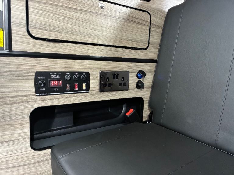 MAINS ELECTRICS AND SECONDARY LEISURE BATTERY, DOUBLE 240V SOCKET, TWIN USB AND 12 VOLT SOCKET ALONG WITH BATTERY HEALTH DISPLAY, CONSUMER UNIT WITH RCD, SPLIT CHARGE RELAY, 4 X 12V LED LIGHTS, 50 LITRE FRIDGE/FREEZER, PERMANENT ROOF AWNING RAIL FOR DRIVE AWAY AWNING.