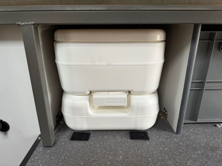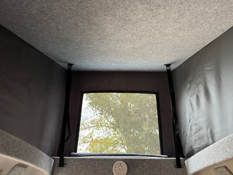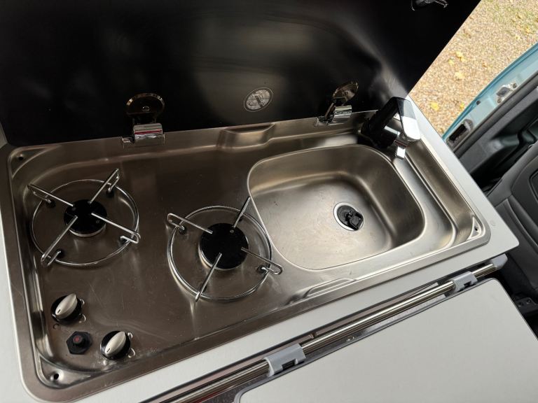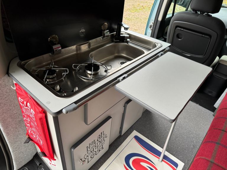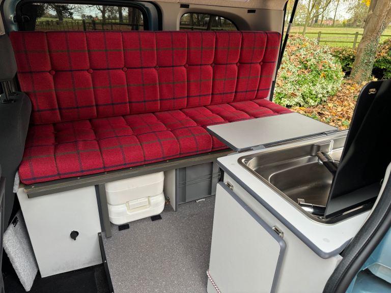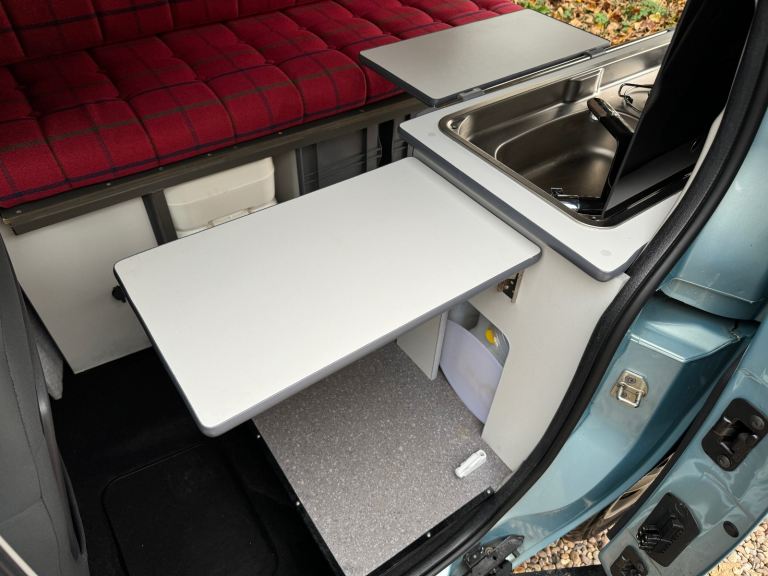 Specification includes: Elevating roof, side sofa that turns into small double bed, 2 x tables, 2 ring gas hob, sink with cold water tap, Air Con (front cab), remote central locking, privacy glass to rear, 240v hook up, 240v socket, 12v socket, leisure battery system with split charger, 12v lighting, CD player, Fiamma Bi-Pot toilet.
