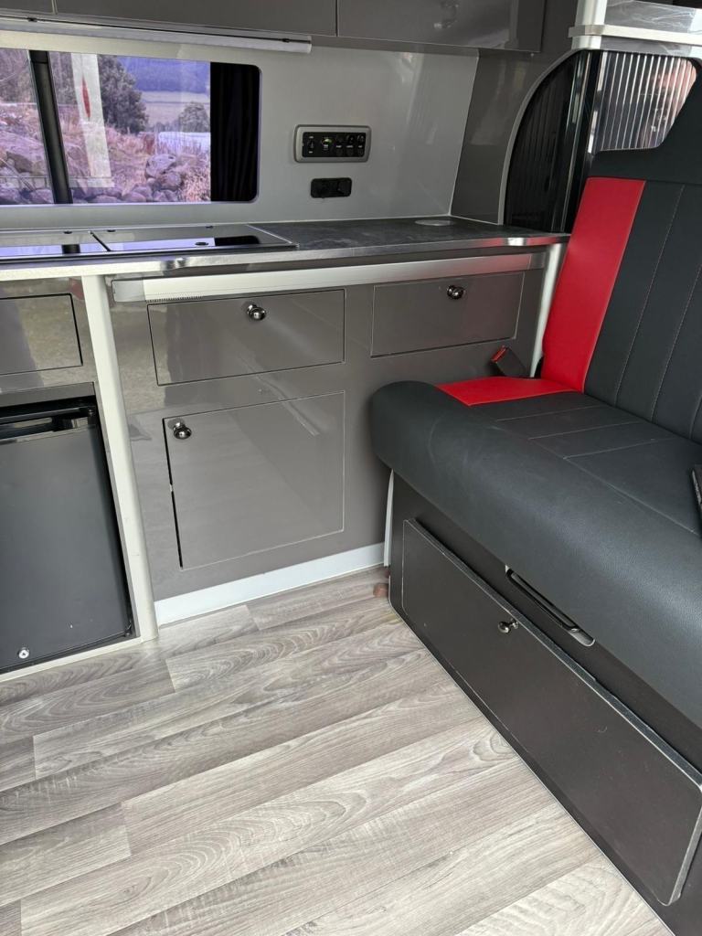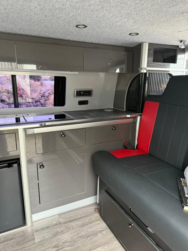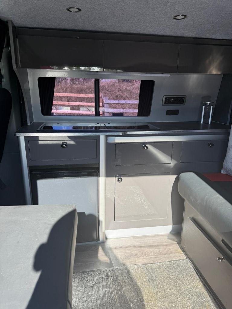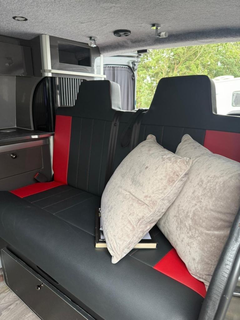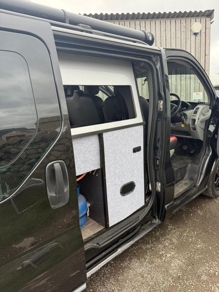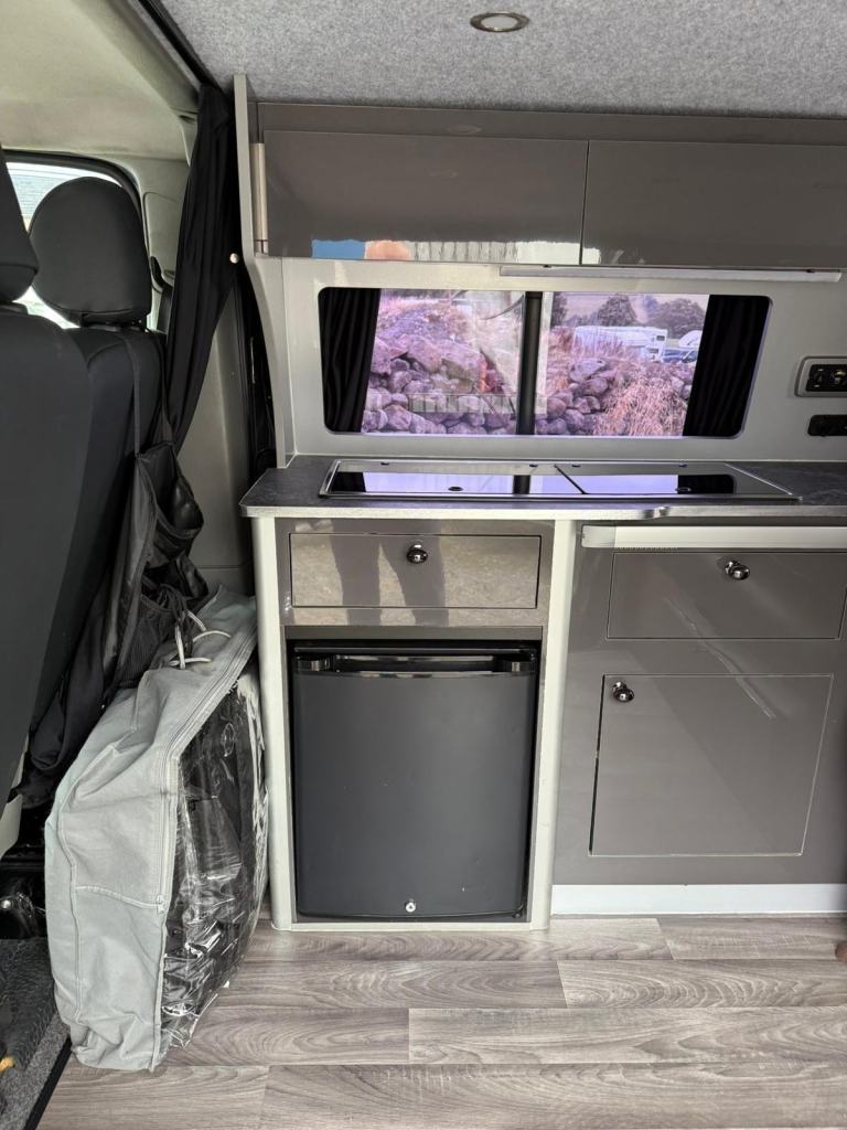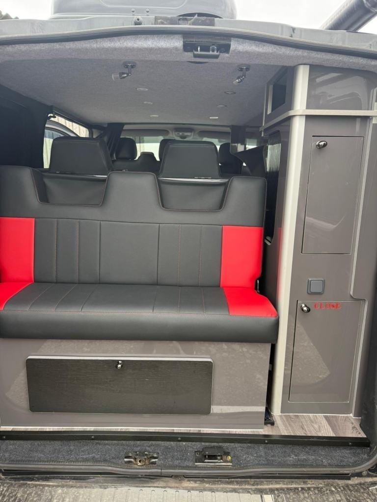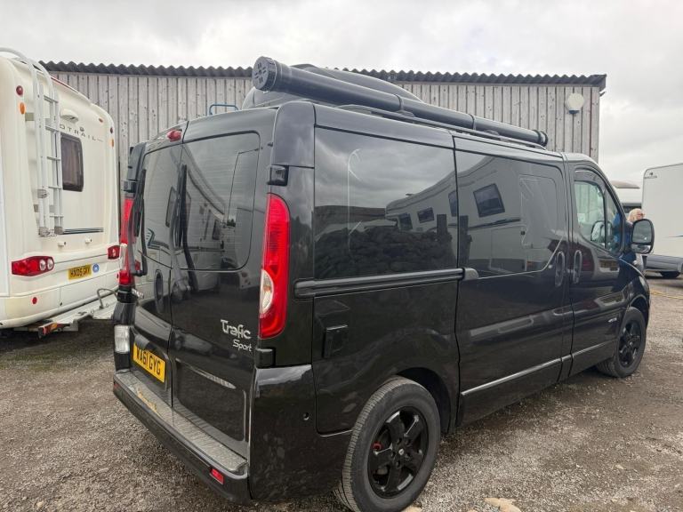 Presenting the Renault Trafic in Metallic black - A very well cared for camper that boasts a sink, gas burner stove and fridge. Nearby is a comfortable seating and eating area which converts to double bed at night. There is lots of useful storage which is all set in a modern clean design. Other features include - AUTOMATIC, ambient lighting, air con, sliding doors, night heater, top box, Porta Potti (toilet) and much more!