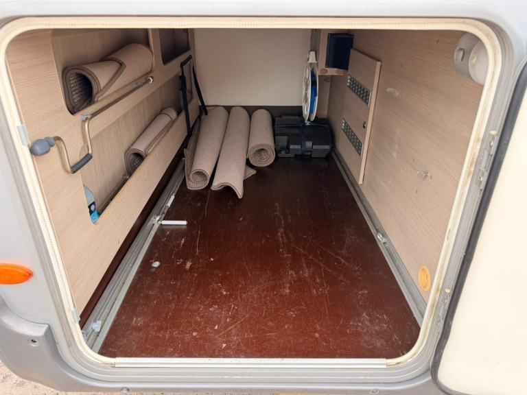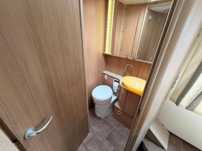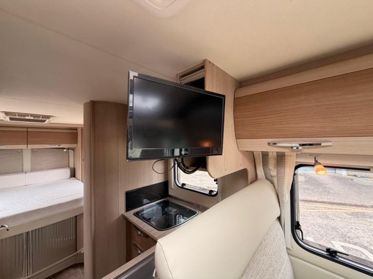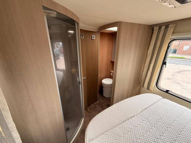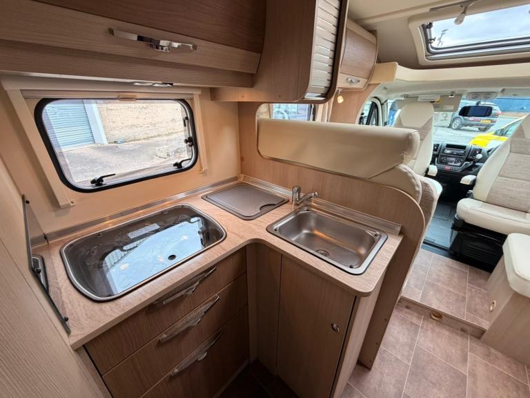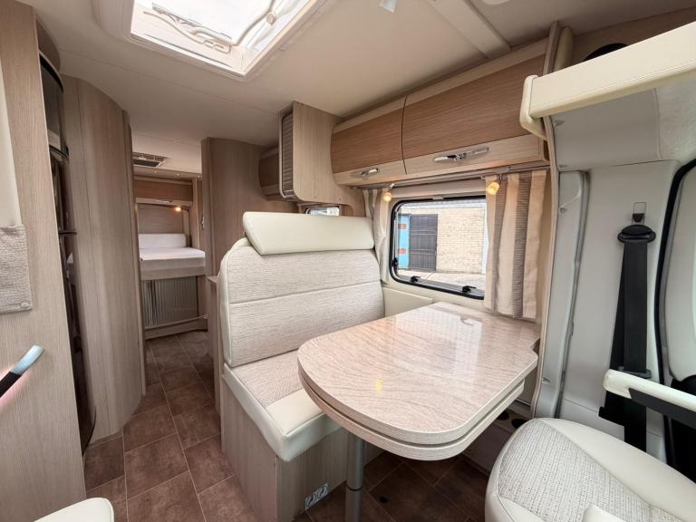 The Burstner T740 comes with a rear island bed, corner shower unit & separate toilet, front dinette with swivel seats and a centre kitchen with a 3 burner gas hob, tec tower unit with oven/grill,