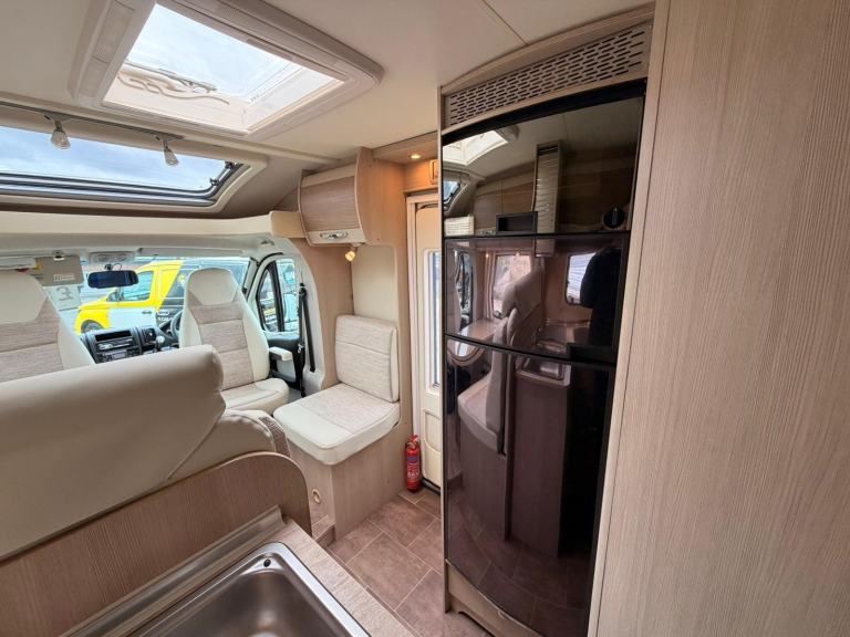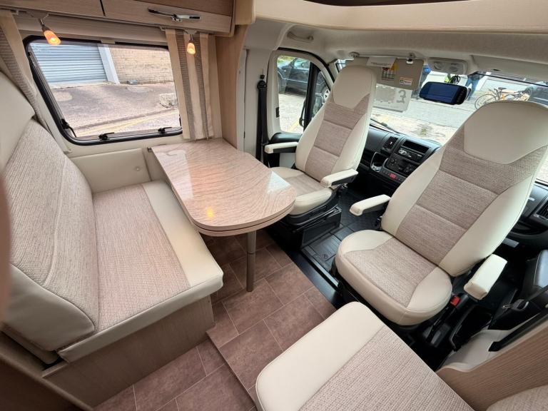 large fridge with separate freezer, truma combi heating, dinette with 2 x travelling seats, dineete makes a further bed, swivel seats, leather upholstery, cab air con, cruise rev camera, awning, outside bbq point, shower, bike rack, alloy wheels.