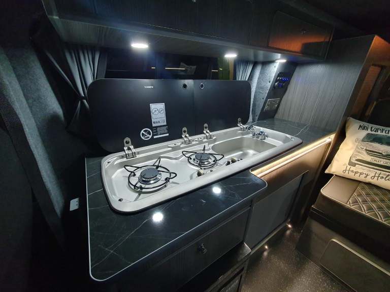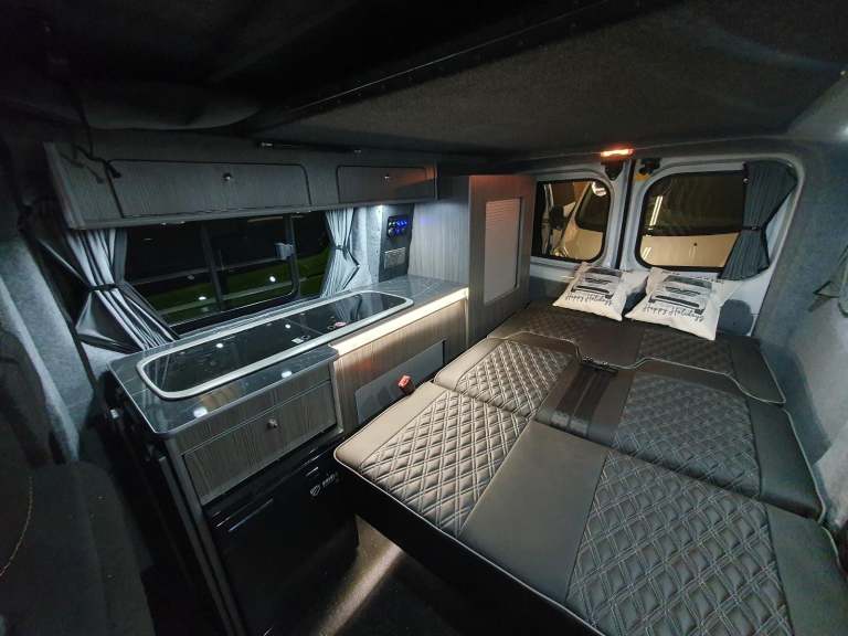 2 Burner Hobs, Large Sink, 12v 50L Compressor Fridge, Cupboard Space, Pull Out Long Draw, Control Panel For Power, Water Pump, 240v Hook Up, Leisure Battery, Leisure Battery Trickle Charger For Mains Hook Up, Fold Out Bed Rock And Roll Bed With Fabricated Mattress, Blinds, Hard Floor, Table, Work Tops, Overhead Storage, Coloured LED Interior Lights, Reading Lights, Long Cupboard, Gas Bottle Storage And Strap.