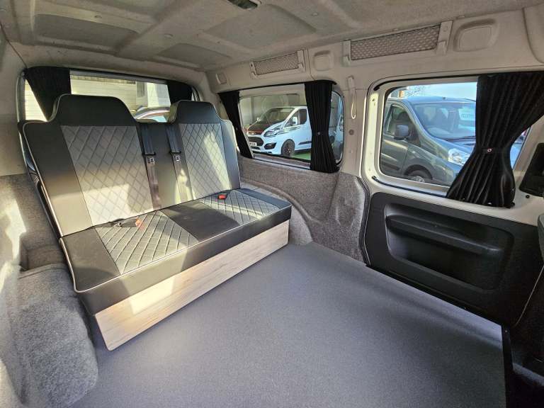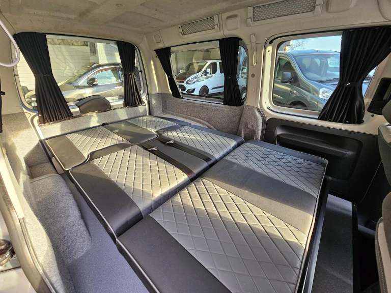 All-round Van-X Black Out Curtains, Hard Wearing Grey Altro Flooring, 112cm Rock and Roll Pul-Out Bed, 2 Seatbelted Rear Seats, Two Tone Faux Leather Seats, Insulation, Carpetted Interior Panels, Tailgate Rear Door, Under Bed Storage, Awning Rail.