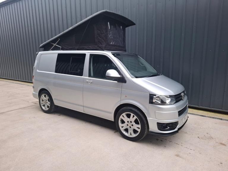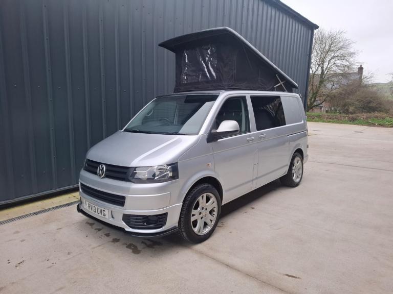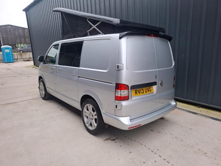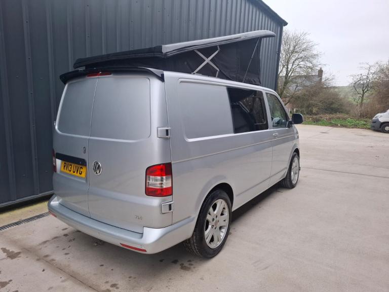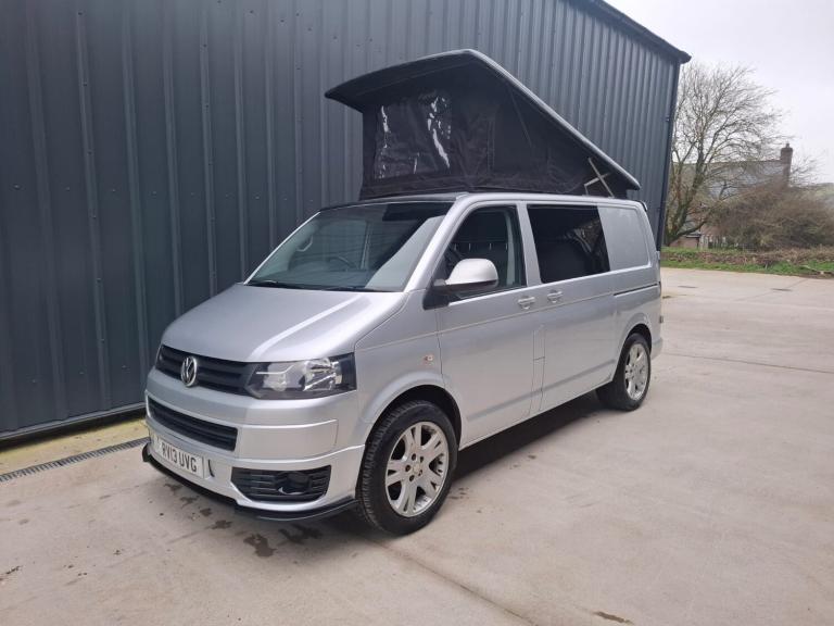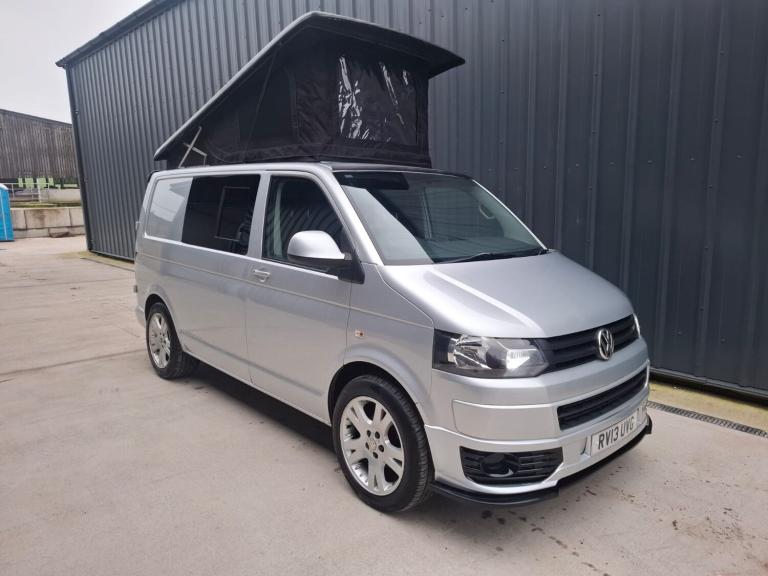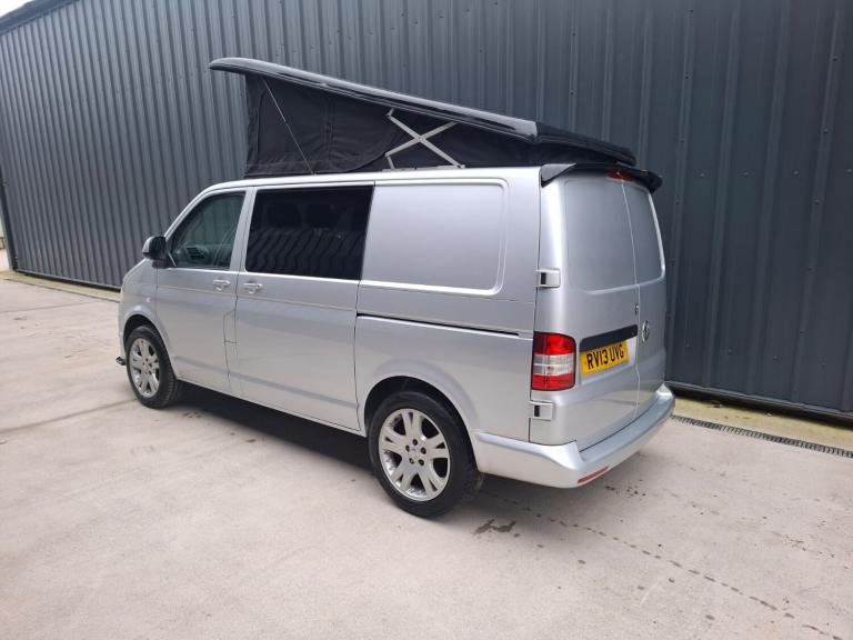 2013 (13) Volkswagen Transporter T5.1 Trendline 102PS Camper Van finished in metallic silver, covered 125,000 miles and benefiting from a high-quality camper conversion with a great specification throughout. Trendline model with cruise control and rear parking sensors, pop-top roof with excellent canvas providing additional headroom and sleeping space, full-width rock and roll bed, 12V leisure electrics including USB sockets and downlights, and sitting on upgraded 20"" alloy wheels with Sportline-style front and rear spoilers giving a subtle sporty look. This van has been well maintained with a full service history and will be supplied with a fresh 12 months MOT and a full service included in the sale, making it a well-sorted, ready-to-use camper ideal for weekends away or longer trips.