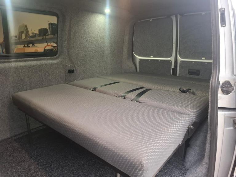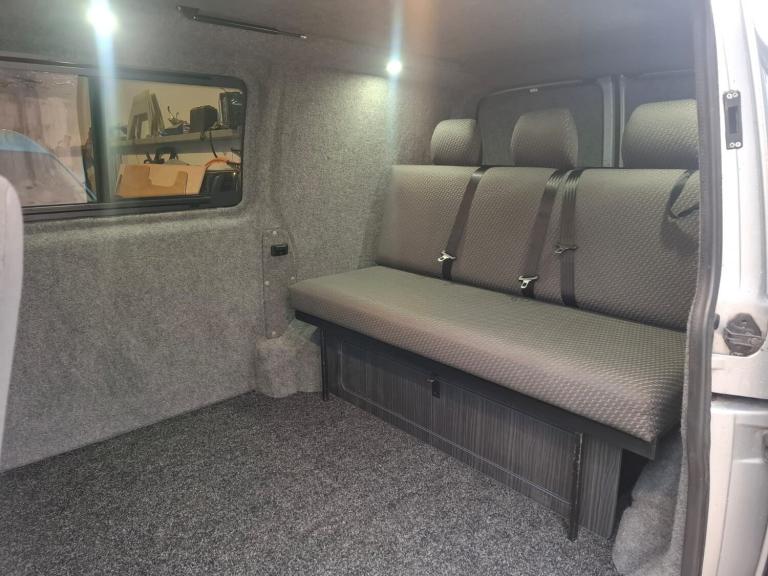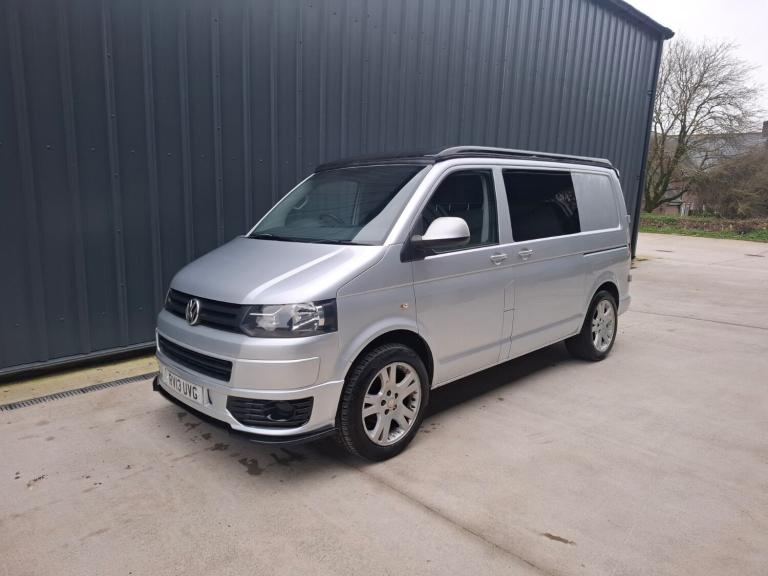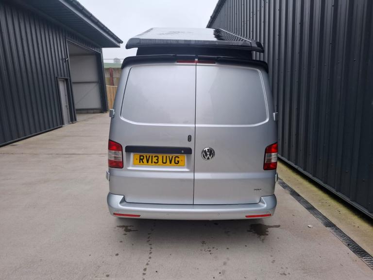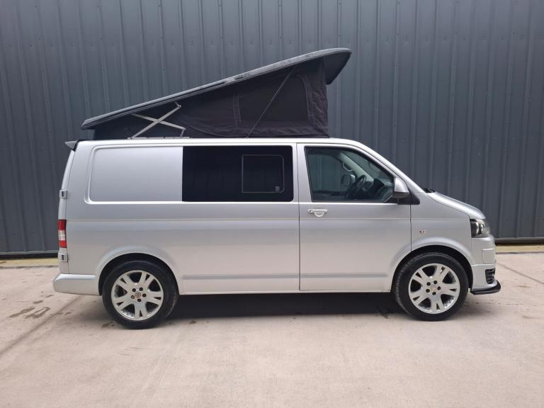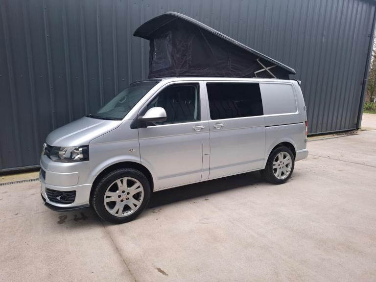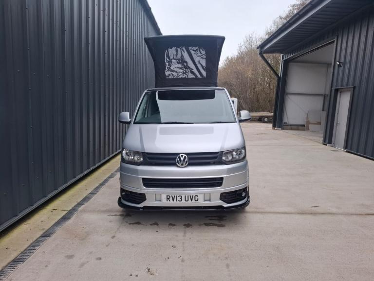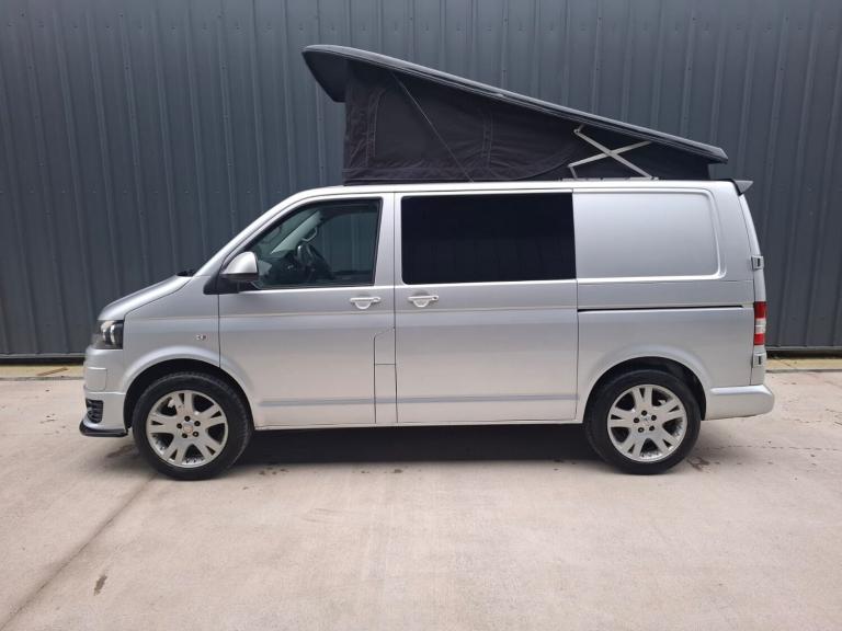 2013 (13) Volkswagen Transporter T5.1 Trendline 102PS Camper Van finished in metallic silver, covered 125,000 miles and benefiting from a high-quality camper conversion with a great specification throughout. Trendline model with cruise control and rear parking sensors, pop-top roof with excellent canvas providing additional headroom and sleeping space, full-width rock and roll bed, 12V leisure electrics including USB sockets and downlights, and sitting on upgraded 20"" alloy wheels with Sportline-style front and rear spoilers giving a subtle sporty look. This van has been well maintained with a full service history and will be supplied with a fresh 12 months MOT and a full service included in the sale, making it a well-sorted, ready-to-use camper ideal for weekends away or longer trips.