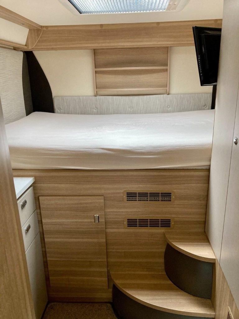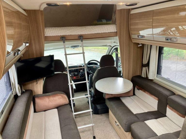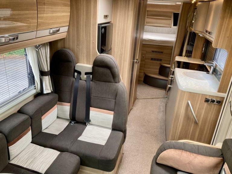 Layout is over-cab double bed, central lounge and dining area which converts to double bed, central kitchen, central washroom and fixed bed over rear garage.