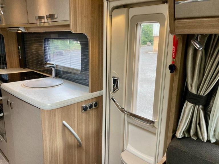 The kitchen area has a hob with 3x gas and 1x electric ring, sink, oven, grill, microwave, extractor fan and fridge with separate freezer compartment which operate on gas or electric. Heating and hot water are provided by a Truma system which operates on gas or electric. The washroom has electric flush cassette toilet, sink and shower enclosure. The rear bedroom has an access hatch to the large rear garage and is fitted with a TV DVD. The motorhome has a directional TV aerial, electric hook up, a further TV DVD player in the lounge, 230v and 12v power points, full dining table and an additional occasional table. Outside the motorhome has a retractable electric step, reversing camera, detachable tow bar with 13 pin electrics, an awning canopy and a large garage with storage racks. The motorhome has cruise control, cab air-con, alarm and swivel seats.