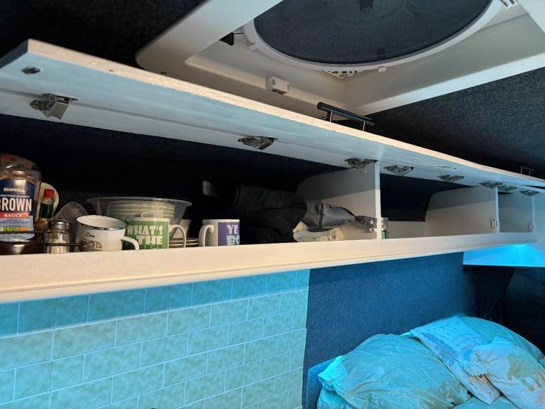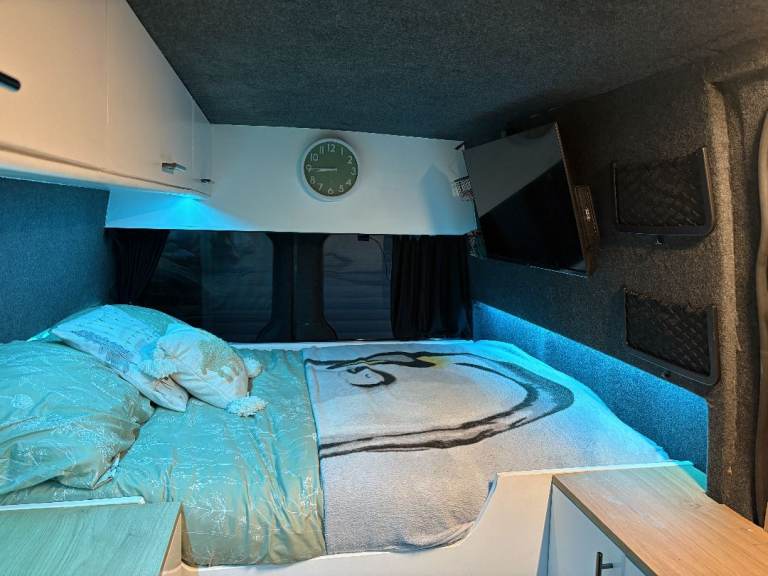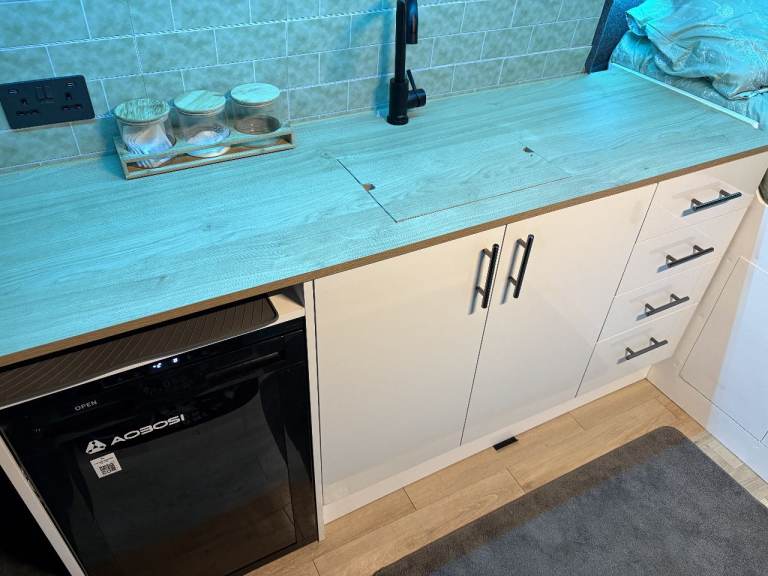 • Kitchen: Plenty of kitchen storage with pull out draws. The bottom plinth pulls out and extra storage underneath. The kitchen has a full working tap (Cold water only), sink and fridge. There is no fixed hob as we use portable camping stoves which will be included in the price. There is a 70-litre water tank installed