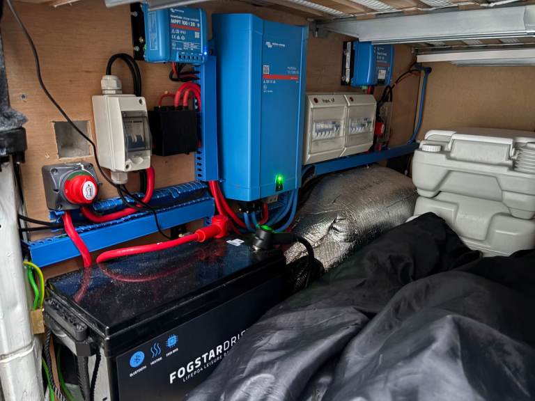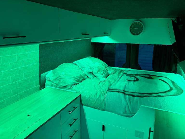 • Electrics: Solar panels, split-charge system, leisure battery, USB ports, RGB lighting, Fixed warm white light, 230v sockets, 12v TV with DVD player, Diesel heating system. This van can be off grid. During the winter 2-3 days with occasional driving. Have not experienced off grid in summer months.