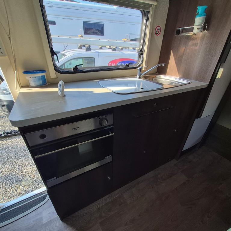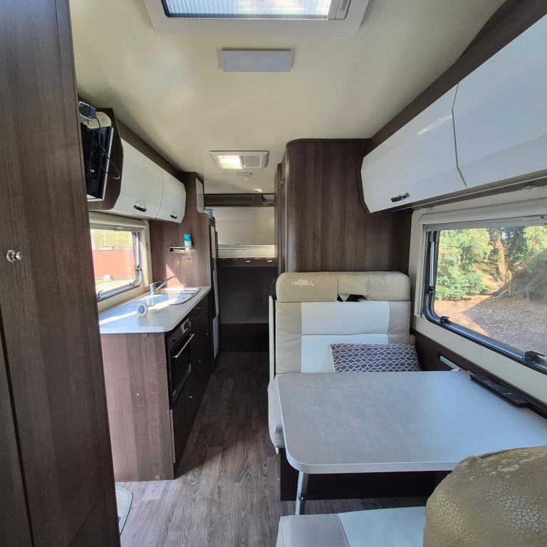 Motorhome Depot Leeds have this 2016 Roller Team Zefiro 675 5 Berth 6 Belt Rear bunk with garage motorhome for sale. Built on a 2.2lt Ford Chassis with a 6 speed manual gear box and comes with cab air con and a reversing camera and weighs only 3500kg so can be driven on a standard uk licence.The layout comes as follows to the front we have a very spacious over cab double bed we then drop down to the 4 seat dinette that comes with 4 travelling seat belts and converts into another double bed opposite this we have a wardrobe with hanging rail. To the centre of the motorhome we have the kitchen that comes with a combi oven/grill, 3 burner gas hob, sink unit and a fridge freezer. Facing this we have the washroom with a standard cassette corner wash hand basin and a separate shower cubicle. To the rear we have a single bunk bed with a large garage space below with access from both inside the motorhome or through the large garage doors to both sides of the motorhome. The motorhome also comes with a 4 cycle bike rack and refillable gas bottle.