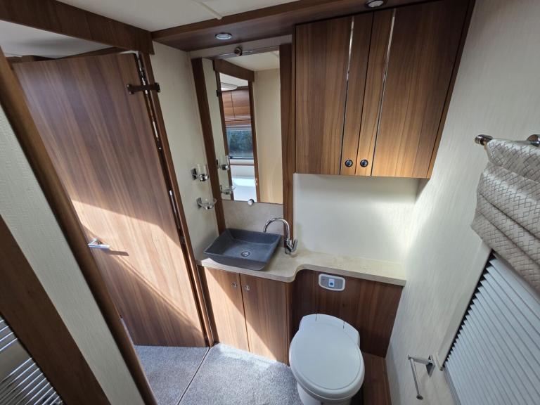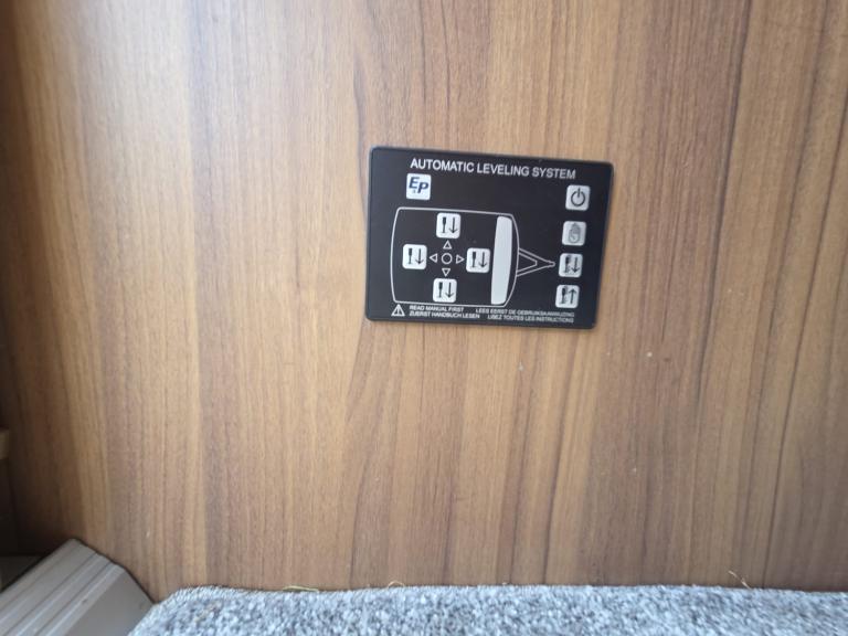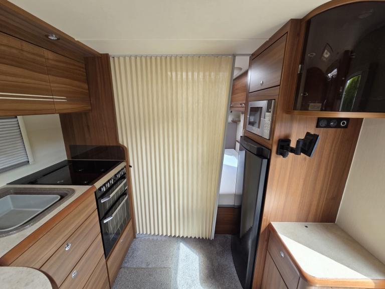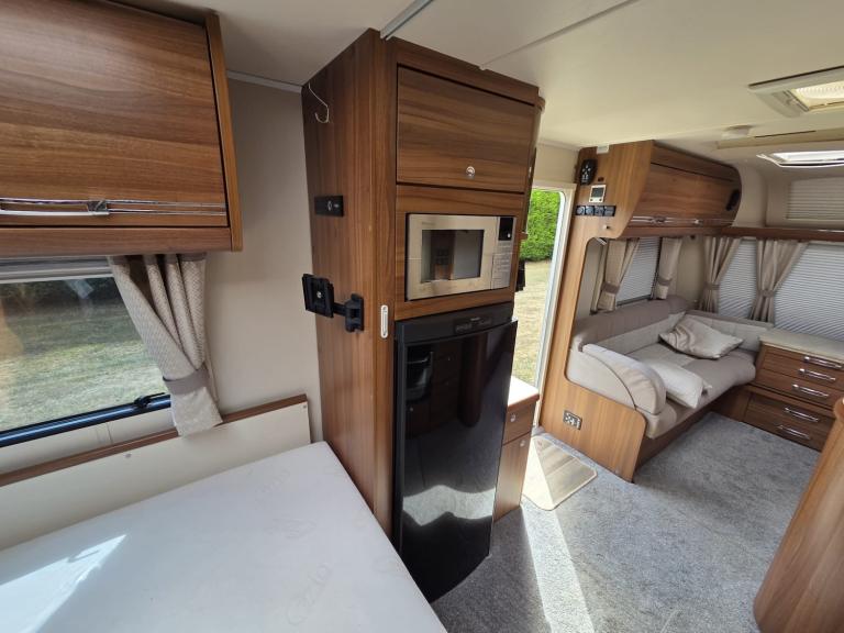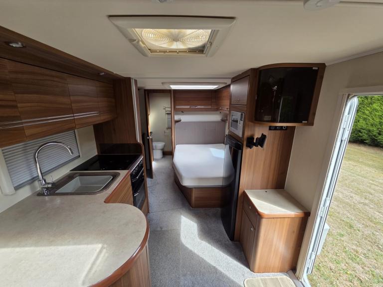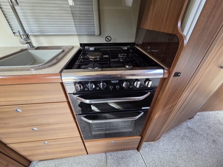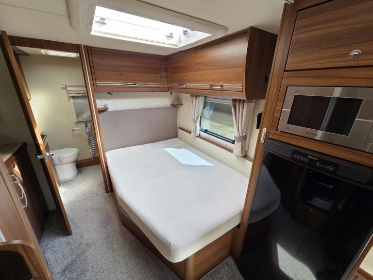 Large lounge, Offside kitchen, Side fixed bed, End washroom, Big fridge, Separate freezer, Microwave, Full oven, Dual-fuel hob, Wet locker, Gas BBQ point, Mmains socket, On-board water tank, Deep overhead lockers, Central Heating, Solar Panel, Self Levelling, Stabiliser Hitch, TV & AWning available by negotiation