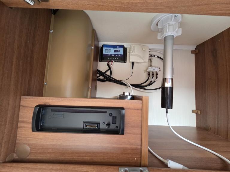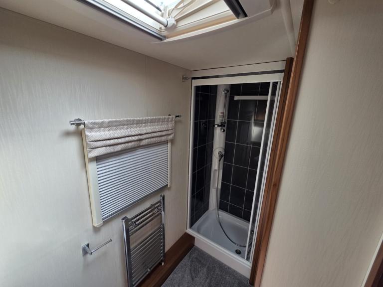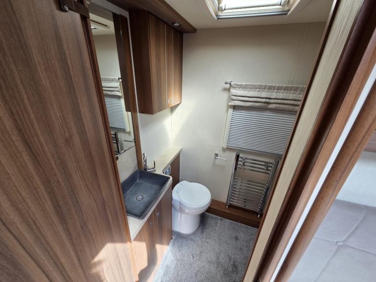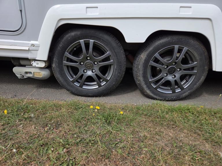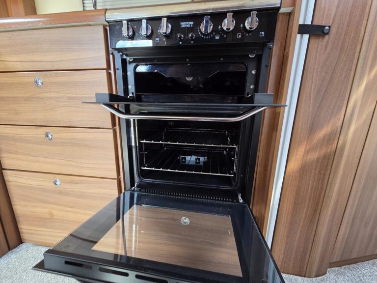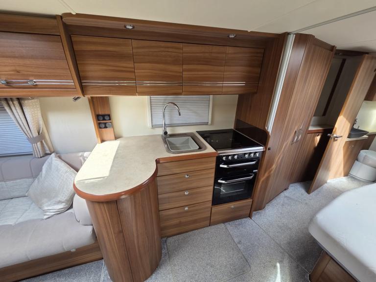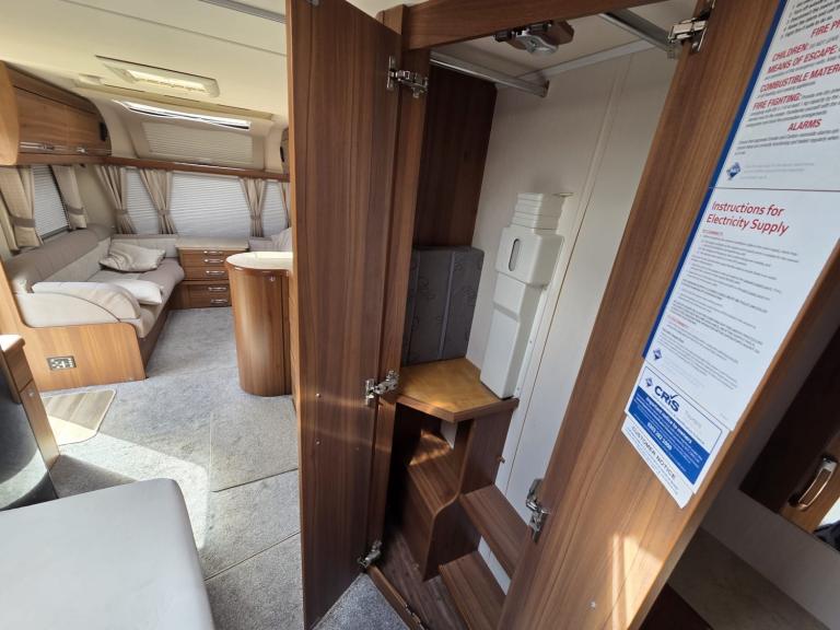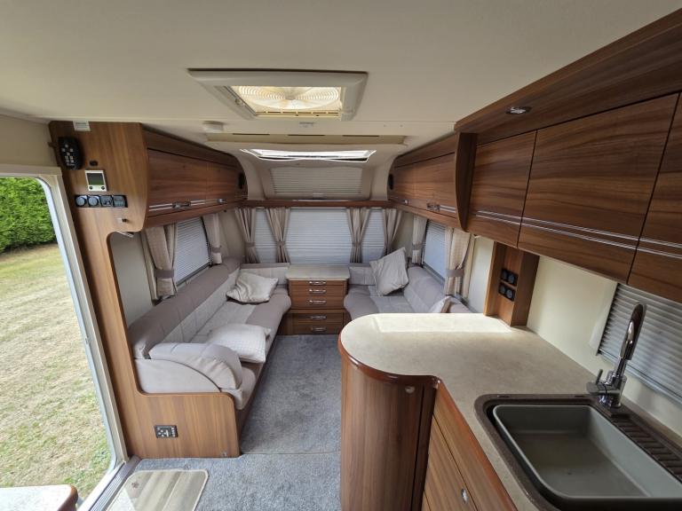 Large lounge, Offside kitchen, Side fixed bed, End washroom, Big fridge, Separate freezer, Microwave, Full oven, Dual-fuel hob, Wet locker, Gas BBQ point, Mmains socket, On-board water tank, Deep overhead lockers, Central Heating, Solar Panel, Self Levelling, Stabiliser Hitch, TV & AWning available by negotiation