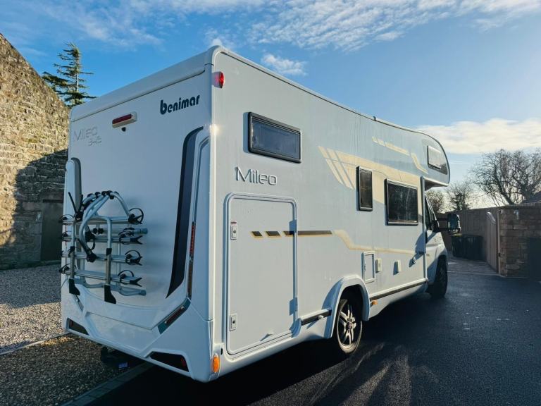 This Benimar Mileo 346 is a fantastic 6 berth motorhome with 6 travelling seat belts. Benimar is a Spanish built motorhome that is become well known in the UK market for is stylish designs and excellent build quality. This motorhome is no exception and is the perfect motorhome for a family looking to spend time away together or even for a couple looking to enjoy more space whilst away. It has a brilliant layout with the main features including and extremely comfortable large fixed transverse bed at the rear, large garage, well equipped kitchen and good sized washroom.With just 23,000 miles and a clean, well-cared-for interior, this Mileo 346 is ready for its next chapter.2017 Benimar Mileo 346 – Fiat 2.3 150 BHP 6-speed manual6 berth / 6 seat beltsC1 licence requiredMileage: 23,000 milesLength 7.49 m / Width 2.3 m / Height 2.89 mFull service & habitation checks (March 2025)Large garage, over-cab bed, fixed rear bed, awning, solar, reversing cameraA superb high-spec family motorhome offering flexibility, comfort and excellent value. Benimar Mileo 346s rarely stay on the market for long.This Mileo 346 is built on the ever popular Fiat Ducato chassis and has a 2.3 litre, 6 speed engine with manual gearbox and 150 BHP. The cab is packed with extras including cab air conditioning, cruise control, Sat Nav, Bluetooth, DAB radio and reversing camera. The motorhome is 4400kg so you will need a C1 licence to drive but it does mean that you have a very generous payload to carry everything you need.The main living area is in lovely condition and has a wonderful stylish look and feel. At the front there is a double dinette seating area with a further single side facing seat. There is also a removable dinette table that is the ideal place to enjoy and meal, snack or even just a nice refreshing drink of choice whilst browsing and laptop or tablet. Moving back there is a very well equipped kitchen featuring an oven, grill, hob with 3 gas burners, microwave oven, sink with mixer tap and large fridge with separate freezer.The Benimar Mileo 346 is an exceptionally comfortable motorhome to sleep in. It has a large double fixed transverse bed at the rear, another very large double over cab bed and a further smaller double that can be made up for the dinette seating. It also has a good sized washroom featuring a Thetford flush cassette toilet, sink and separate shower. The motorhome has heating and hotwater provided by the extremely easy to use Truma Inet system.One of the main features of the 346 is the large garage at the rear - the door is 115cm high x 80 cm wide - so plenty of storage room. It also comes with a solar panel, large wind-out awning, external bbq and shower points and bike rack.In summary, this an absolutely fabulous family motorhome giving you everything you need to have amazing trips away. It looks amazing and is presented in great condition and is a motorhome you would be proud to own.