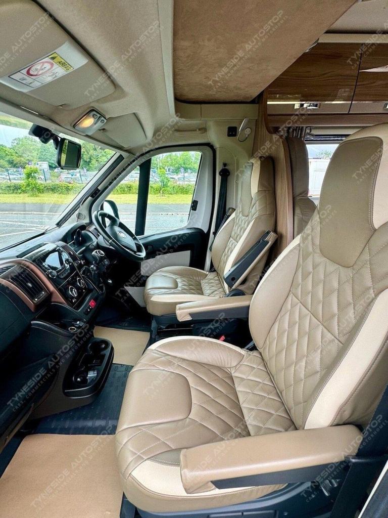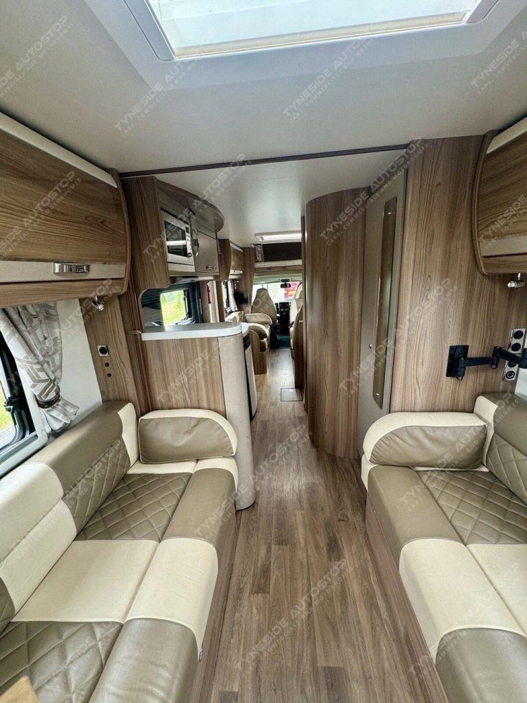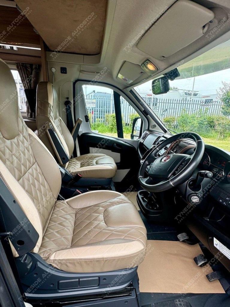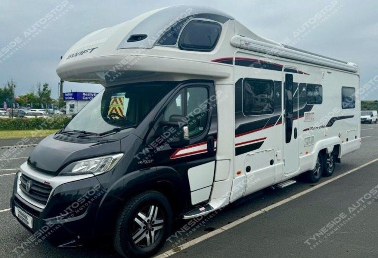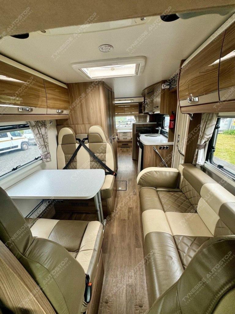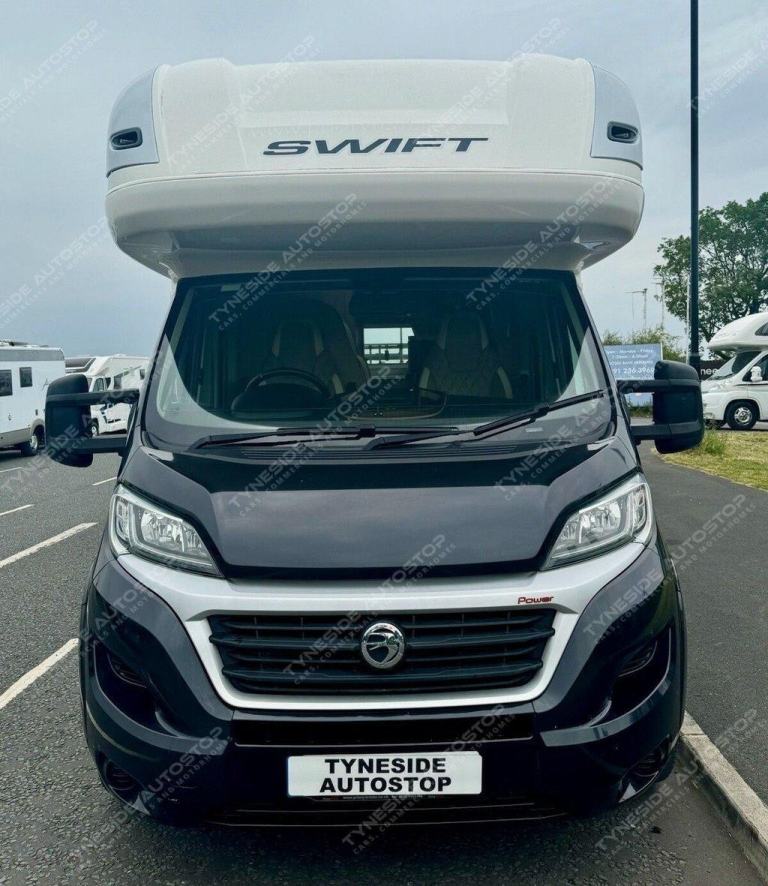2017 SWIFT KON-TIKI 649 BLACK EDITION 6 BERTH MOTORHOME FANTASTIC SIZE AND LAYOUT WITH FOUR EXTRA TRAVEL SEATBELTS SIX IN TOTAL, TOWARDS THE REAR IS A LARGE LIVING SPACE WITH SIDE FACING SEATS THAT CONVERT INTO A LARGE DOUBLE BED, DIVIDING BLIND TO MAKE THE BEDROOM PRIVATE, FRONT DINING AREA WITH TABLE THAT CONVERTS INTO A LARGE DOUBLE BED, AND A LARGE OVER CAB DOUBLE BED TO COMPLETE THE SIX BERTH LAYOUT, GOOD SIZE KITCHEN AREA WITH WORK TOP SPACE, OVEN-GRILL, 3 GAS BURNER HOB AND ONE ELECTRIC PLATE HOB, UNDER BENCH FRIDGE, GEAT SIZE WASHROOM WITH A WALK IN SHOWER, TOILET, SINK AND VANITY MIRROR. WARDROBE SPACE, FANTASTIC STORAGE OPTIONS ALL ROUND, THREE PIN PLUGS, LED LIGHTS, ALDE HEATING, BIKE RACK, AWNING, REVERSING CAMERA, SIX SPEED GEARBOX, CRUISE CONTROL, AIR CON IN THE CAB, FULL LEATHER, 5000KG