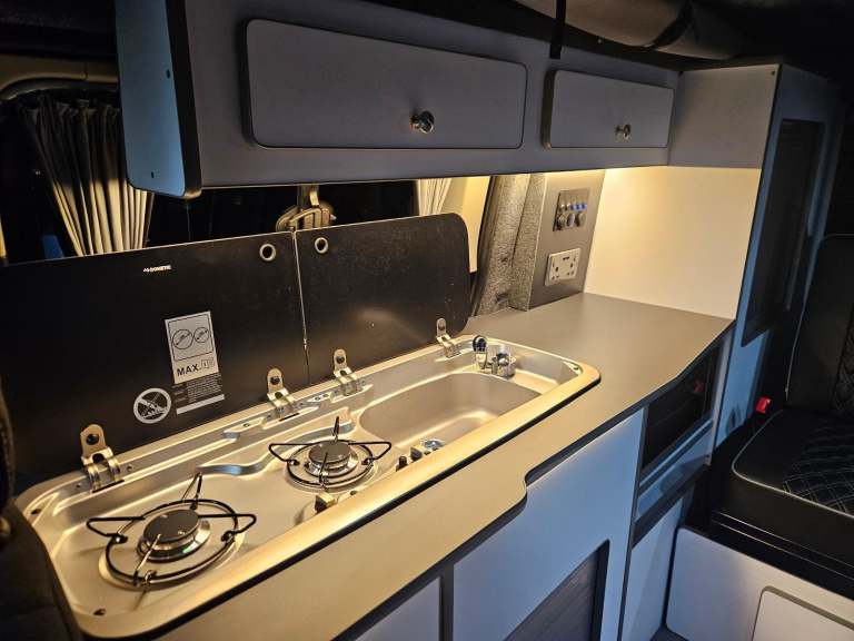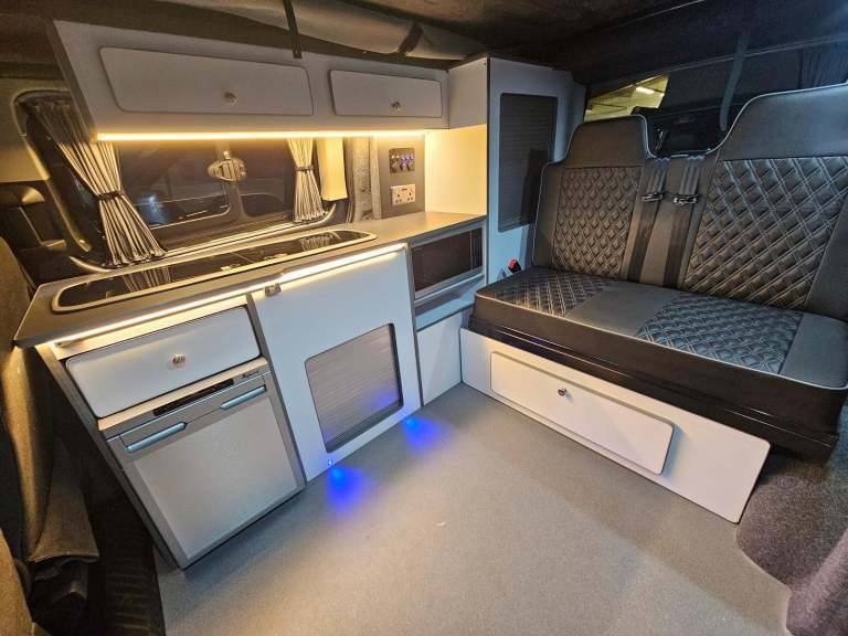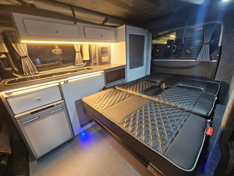 2 Burner Hobs, Large Sink, 50L Compressor Fridge, Cupboard Space, Control Panel For Power, Water Pump, 240v Hook Up Compatible, Leisure Battery, High Amp Leisure Battery Charger For 240v Mains Hook Up, Fold Out Bed Rock And Roll Bed With Fabricated Mattress*, Blinds, Hard Floor, Table, Work Tops, Overhead Storage, Coloured LED Interior Lights, Reading Lights, Long Cupboard, Gas Bottle Storage And Strap.