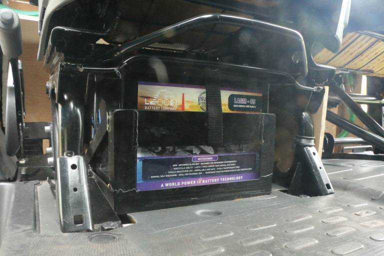 2x 85Ah AGM Leoch Adventurer Leisure Batteries secured under the Driver’s seat