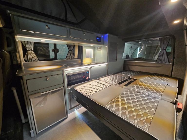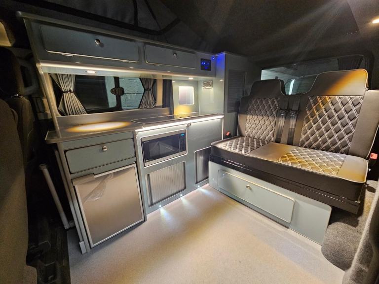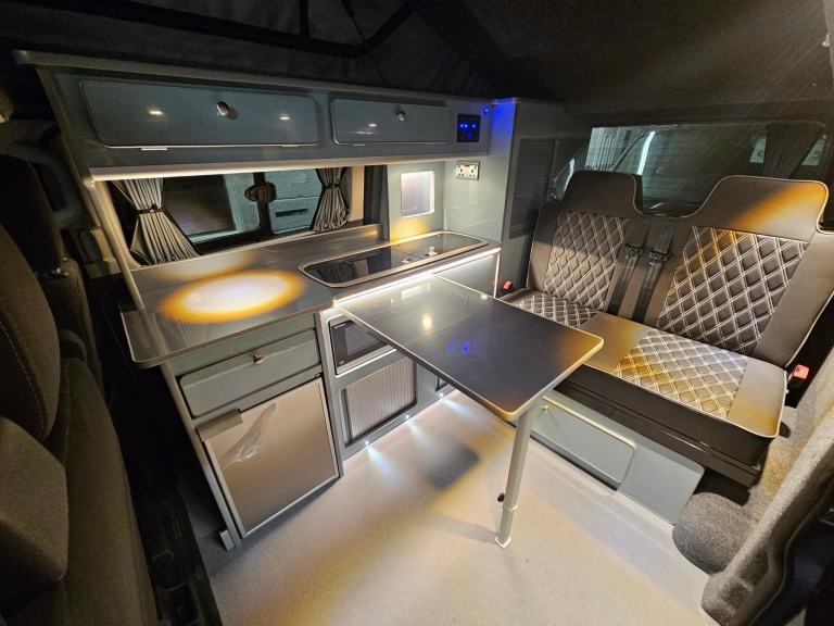 Van Lidz Pop Top Roof, 2 Burner Hobs, Large Sink, 50L Compressor Fridge, Cupboard Space, Control Panel For Power, Water Pump, 240v Hook Up, Leisure Battery, Leisure Battery Trickle Charger For Mains Hook Up, CTEK 250SE DC - DC Charger, Fold Out Bed Rock And Roll Bed With Fabricated Mattress, Blinds, Hard Floor, Table, Work Tops, Overhead Storage, Coloured LED Interior Lights, Reading Lights, Long Cupboard, Gas Bottle Storage And Strap, and Option for Swivel Seat And Much More...