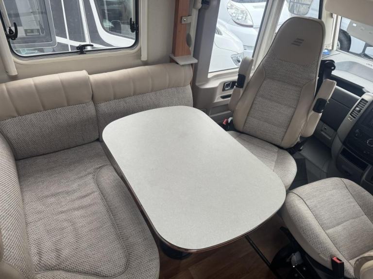 Interior Layout: The living area features an L-shaped lounge with a 360-degree adjustable dining table and swivel cab seats. A flat floor runs throughout the living space.